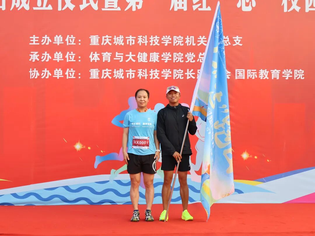 在庄重的授旗仪式中,重庆城市科技学院党委副书记、副校长贾瑞为“红芯”跑团授旗,由红“芯”跑团成员体育与大健康学院教师田汜明老师接旗。这一刻象征着责任与使命的传递,红“芯”跑团踏上新征程,红色旗帜在校园中飘扬,成为激励青年奋进的精神象征。