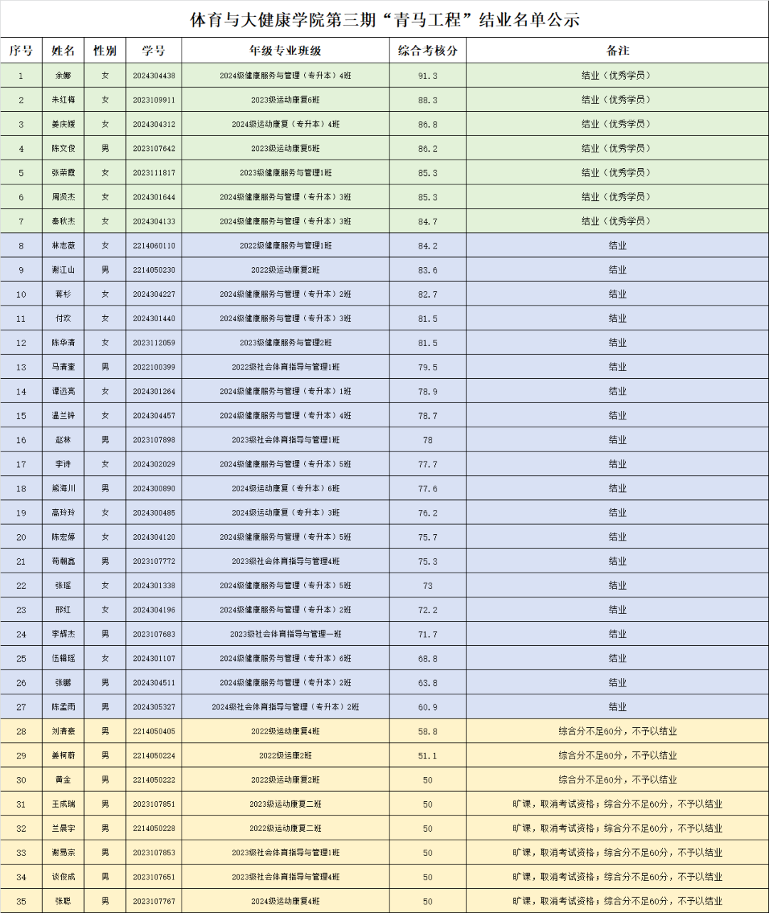 经过理论培训、实践教育及结业考试等环节,我院团总支严格遵循《体育与大健康学院“青马工程”培训考核细则》,对第三期“青马工程”初级培训班学员进行全面考核。现将体育与大健康学院第三期“青马工程”初级培训结业考核公示如下: