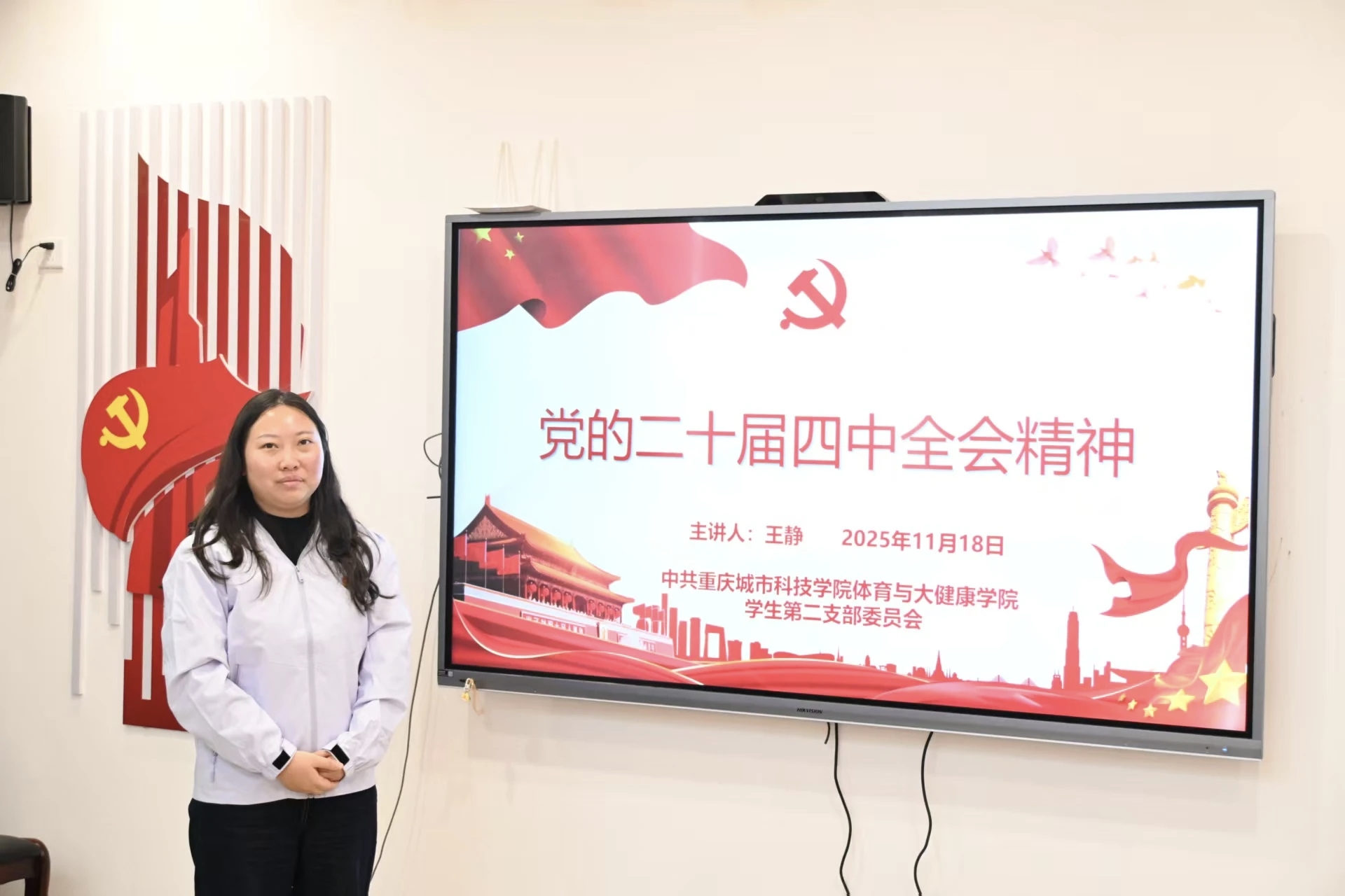 在时代的浪潮中,青年始终是推动社会进步的蓬勃力量。为了深入学习贯彻党的二十届四中全会精神,让党的创新理论在实践中落地生根,中共重庆城市科技学院体育与大健康学院学生第二支部委员会于2025年11月19日在第二行政楼101组织学习党的二十届四中全会精神。学生第二党支部所有党员参加本次学习会议,由体育与大健康学院学生第二党支部书记王静担任主讲人。