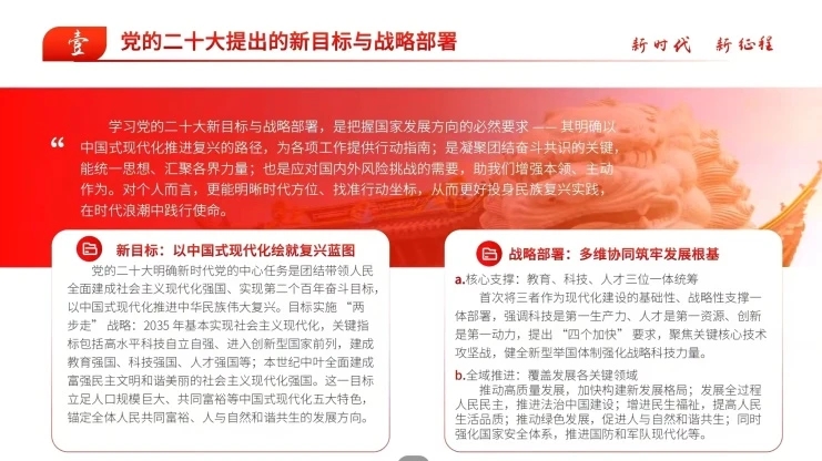 活动围绕党的二十大报告精神展开。苟朝鑫系统阐述了以中国式现代化全面推进中华民族伟大复兴的中心任务与“两步走”战略部署,并详细解读了中国式现代化人口规模巨大、全体人民共同富裕等五个鲜明特征,帮助同学们准确把握国家发展方向。