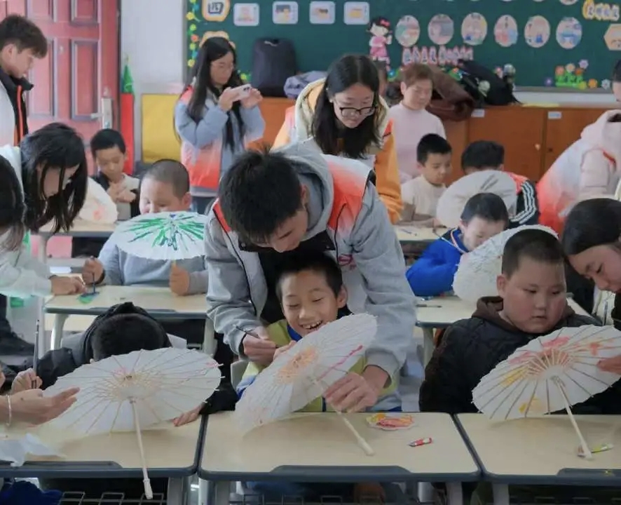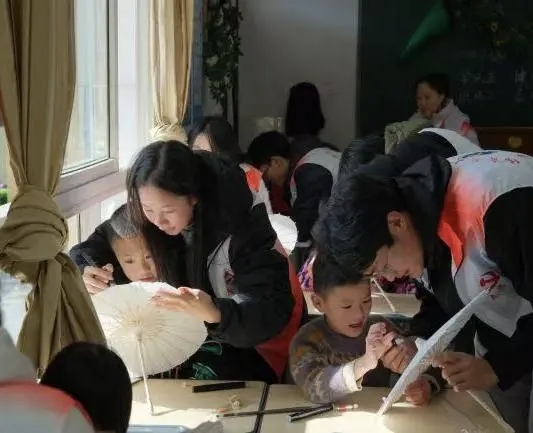 接着,“奇思妙想”纸伞画工坊同步开展。志愿者们温柔指导孩子们拿起画笔,在纸伞上自由创作专属图案。志愿者们全程俯身陪伴,耐心协助孩子们握笔、调色,及时化解创作中的小难题,用鼓励的眼神给予勇气。随后的作品展示环节,孩子们高高举起自己的专属创作,脸上洋溢着自豪的笑容,在彼此的欣赏与掌声中,切实收获了满满的成就感与自信心。