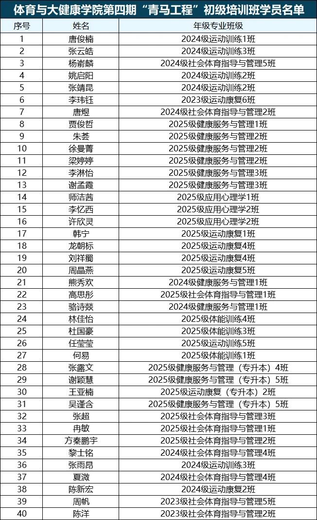 为深入学习贯彻习近平新时代中国特色社会主义思想、党的二十大和二十届二中、三中、四中全会精神,认真贯彻落实习近平总书记关于青年工作的重要思想,巩固和扩大党执政的青年群众基础,培养造就一批用马克思主义中国化最新理论成果武装的青年马克思主义者,引导我院青年学子成长为中国特色社会主义事业的合格建设者和可靠接班人,不断提高我院青年学子的政治素养、理论水平、创新能力和实践能力,经共青团重庆城市科技学院体育与大健康学院总支部委员会研究决定,现开展体育与大健康学院第四期青年马克思主义者初级培训班。经个人申请、辅导员推荐、学院团总支审议,拟推荐张超等38名同学为体育与大健康学院第四期“青马工程”初级培训班学员,现将名单公示如下: