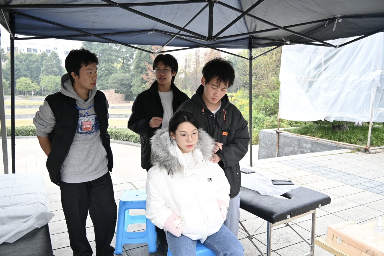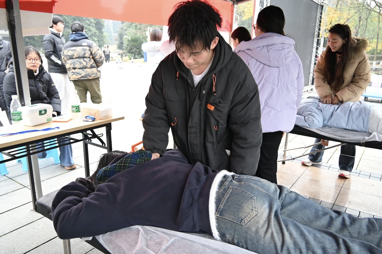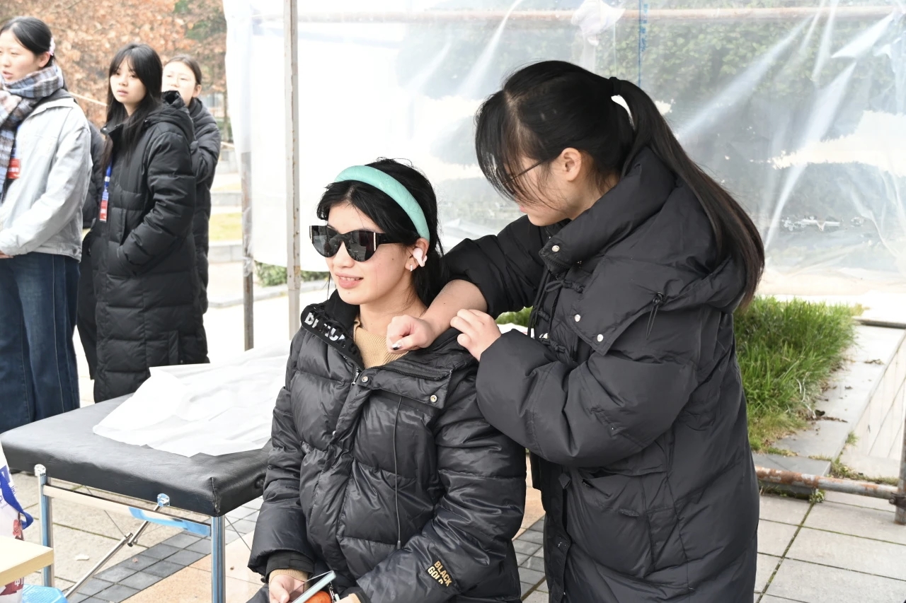 学院的志愿者们依托专业的体育理疗知识与技能,化身考研学子的“健康守护者”,在校园里搭建起暖心服务点,为前来的学子提供肩颈放松、肌肉舒缓、穴位按摩等专业理疗服务。