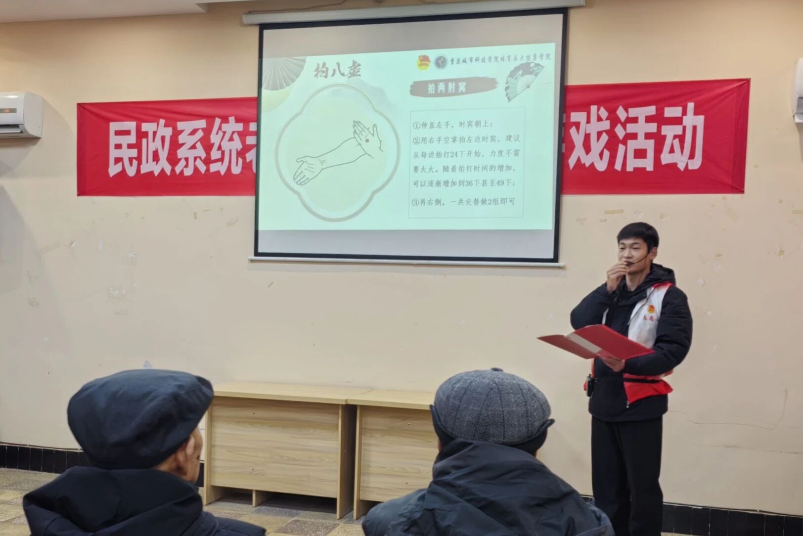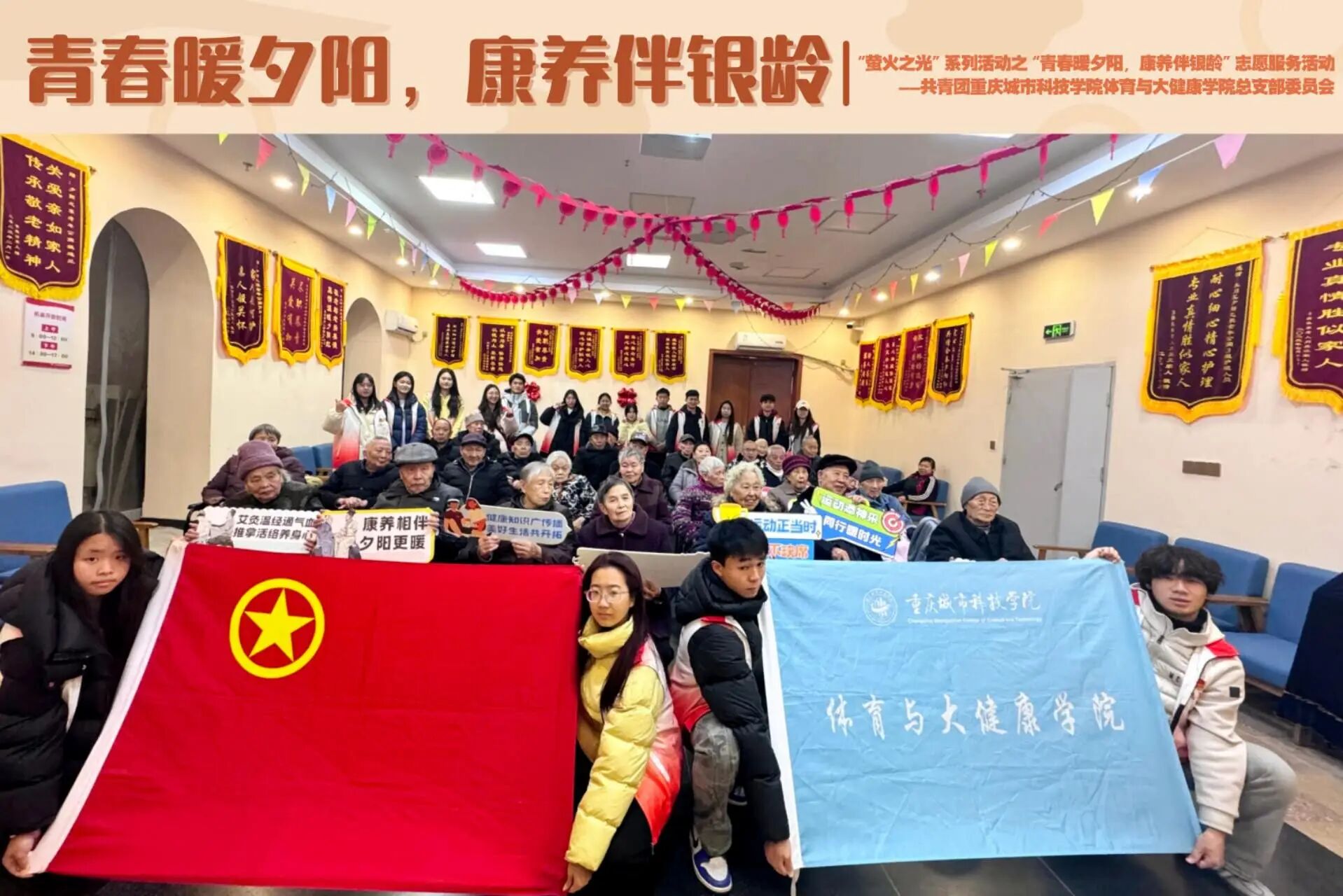 为积极落实应对人口老龄化国家战略,贯彻《深化养老服务改革发展的意见》中“强化老年健康促进”的核心要求,响应健康中国行动部署与新时代“银龄行动”倡议,12月14日,体育与大健康学院团总支·学生会组织志愿者走进重庆市永川区夕阳之家老年公寓,开展“萤火之光”系列活动之“青春暖夕阳,康养伴银龄”志愿服务活动,为老年群体送去专业康养服务与暖心关怀。