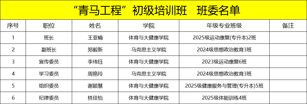 本次“青马初级班”班委竞选,经个人申请、辅导员推荐、现场答辩,最终选出班长1名、副班长1名、纪律委员1名、学习委员1名、宣传委员1名、组织委员1名,现将名单公布如下: