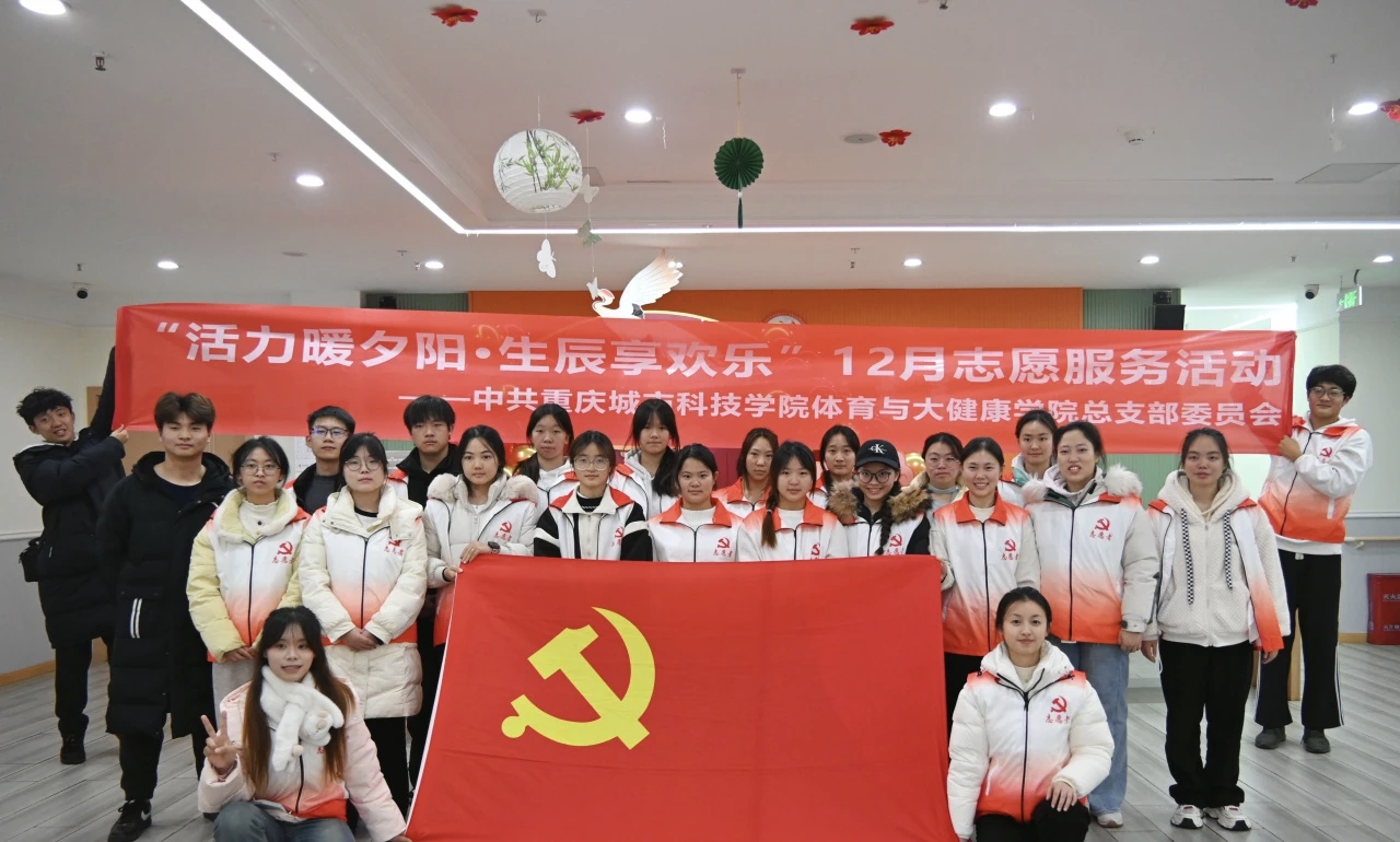 为筑牢党建引领志愿服务根基,用青春行动点亮老年群体的幸福生辰,绘就敬老助老的和谐画卷,重庆城市科技学院体育与大健康学院大学生党建工作中心于2025年12月19日在中山路街道医养融合社区养老服务中心温情开展以“活力暖夕阳·生辰享欢乐”为主题的志愿服务活动。整场活动坚持体院党建“双融双创”特色,由精心编排的节目与互动组成,将真挚的祝福融入每一个环节,为养老院的爷爷奶奶们打造了一场充满心意的生辰盛宴,也让参与人员在欢声笑语中感受着集体的暖意。