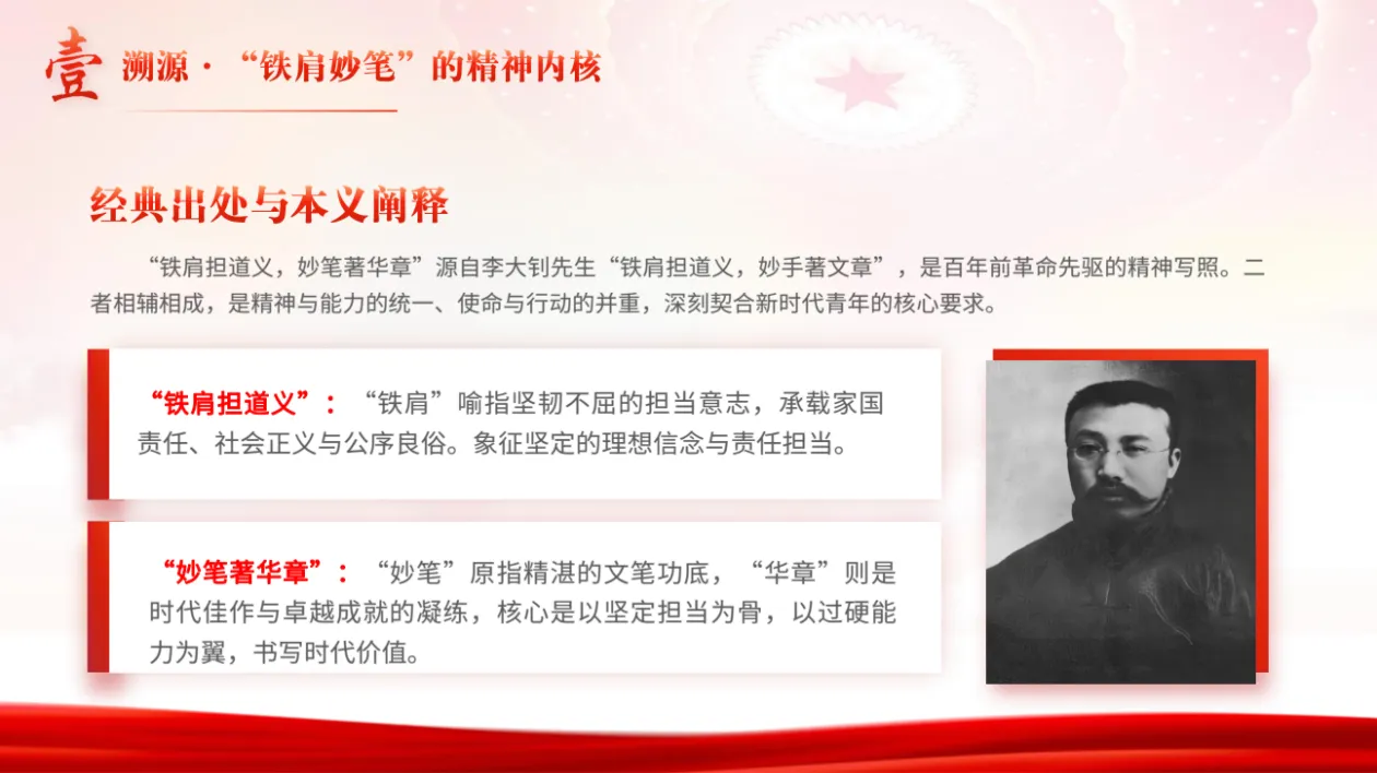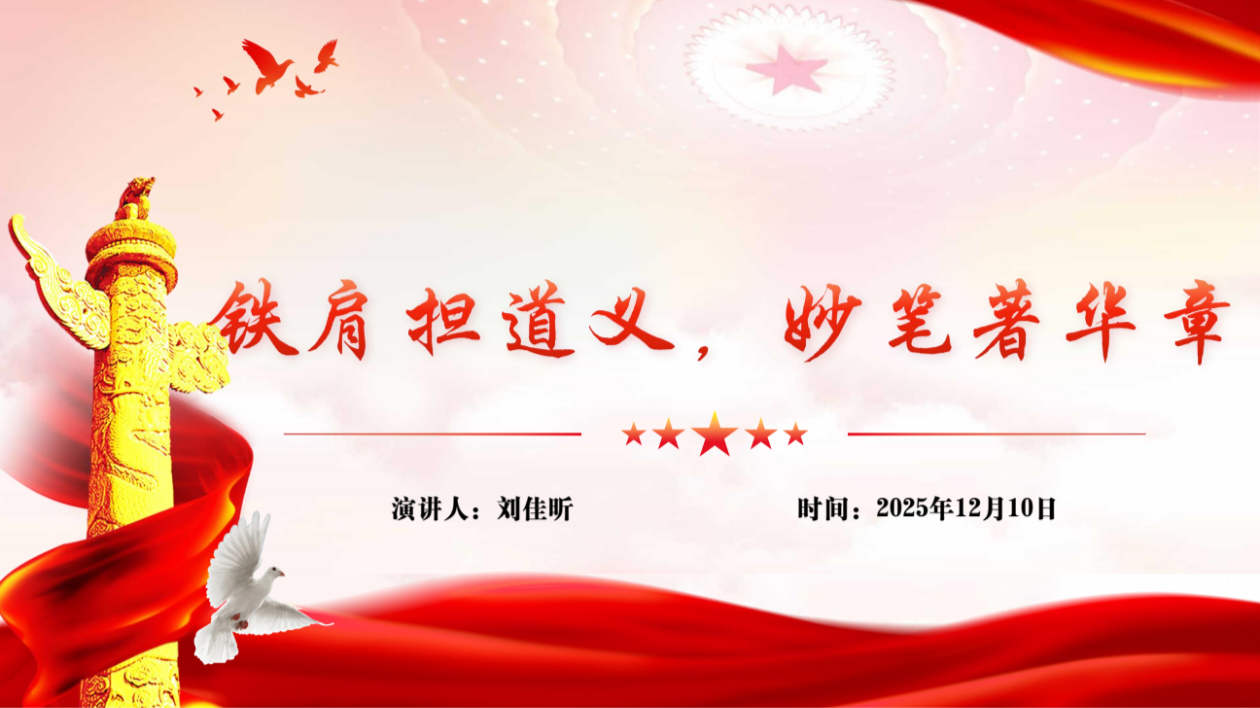 为深入贯彻落实习近平总书记关于青年工作的重要思想,持续推动党的二十大精神学习走深走实,深刻领悟“两个确立”的决定性意义,增强“四个意识”、坚定“四个自信”、做到“两个维护”,引导青年学子在时代浪潮中找准定位、勇担使命,将思政素养与成长实践深度融合,12月10日,体育与大健康学院团总支·学生会开展“每月一学”之十一月“铁肩担道义,妙笔著华章”主题教育活动。活动由团学书记处主席团骨干刘佳昕主讲,学院团学全体成员参会。