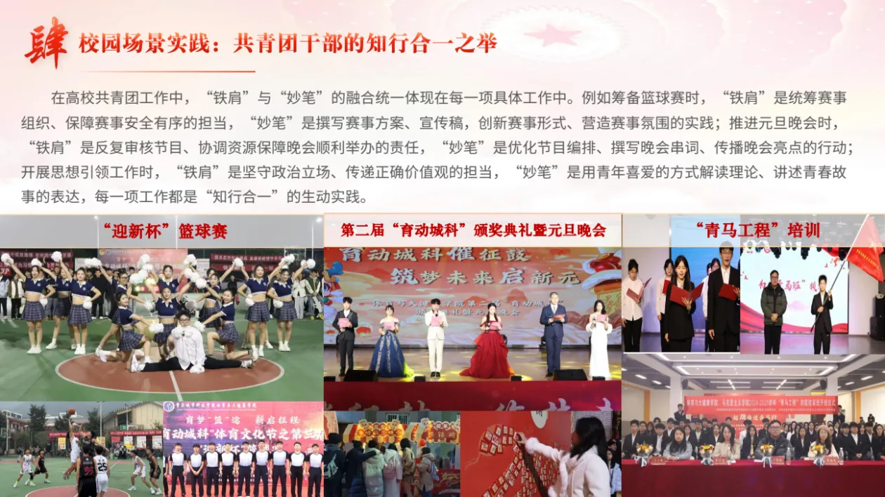 她结合新时代青年典型案例,聚焦“妙笔著华章”的实践路径与“知行合一”的融合统一,鼓励全体团学成员传承先辈精神,践行“有理想、敢担当、能吃苦、肯奋斗”的新时代青年标准。同时引导大家,在团学工作中务实履职,在专业学习中精进本领,在日常实践中传递思政正能量,推动思政精神融入成长全过程,切实把学习成效转化为担当作为的实际行动,在知行合一中书写青春答卷。