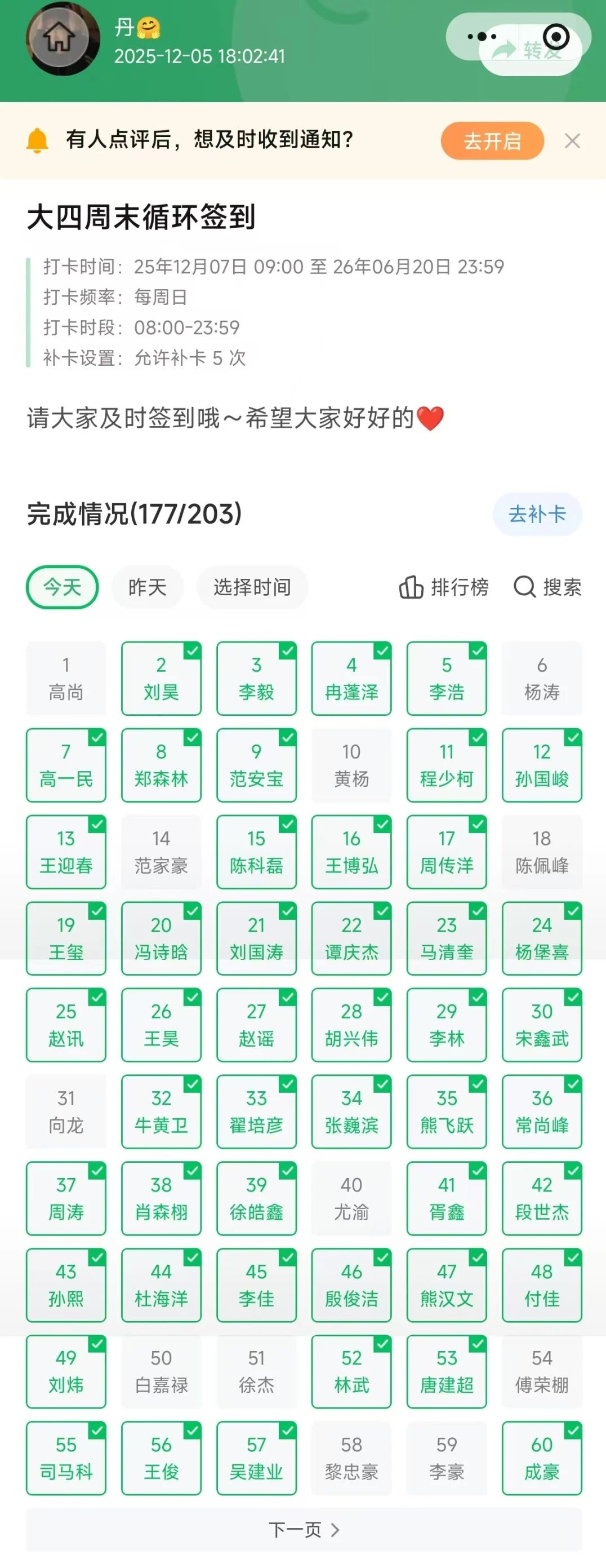 每周日晚,学院各年级辅导员准时抵达所负责班级的指定地点,有序组织学生开展晚点名工作。点名过程中,辅导员严格执行点名流程,采用现场点名、签到确认、线上核实等多种方式,逐一点验学生返校情况,精准排查未到校学生,详细询问未到岗原因,做好登记记录,并第一时间与未到校学生及家长取得联系,核实学生去向,确保每一位学生的安全信息可追溯、可核查。