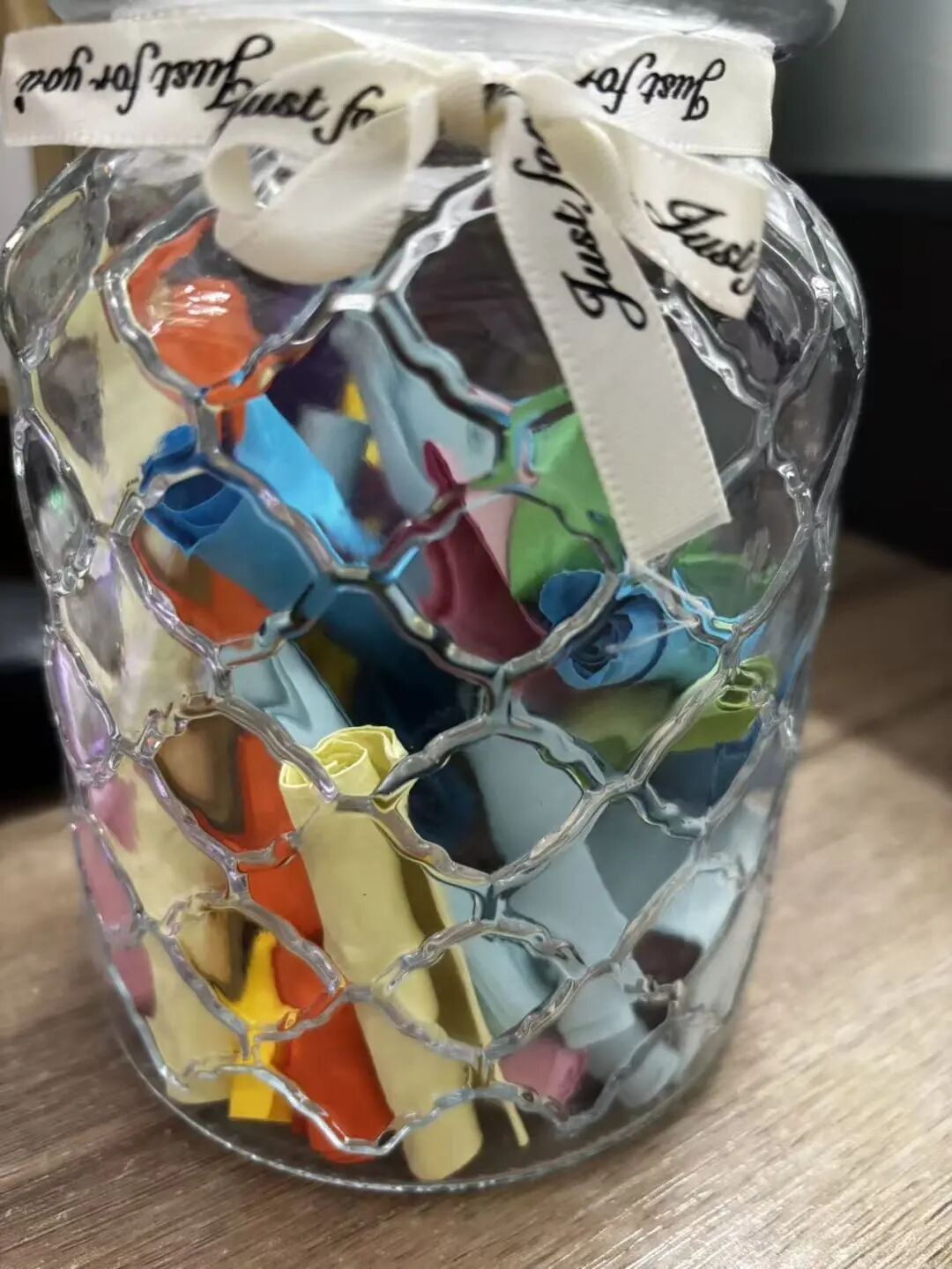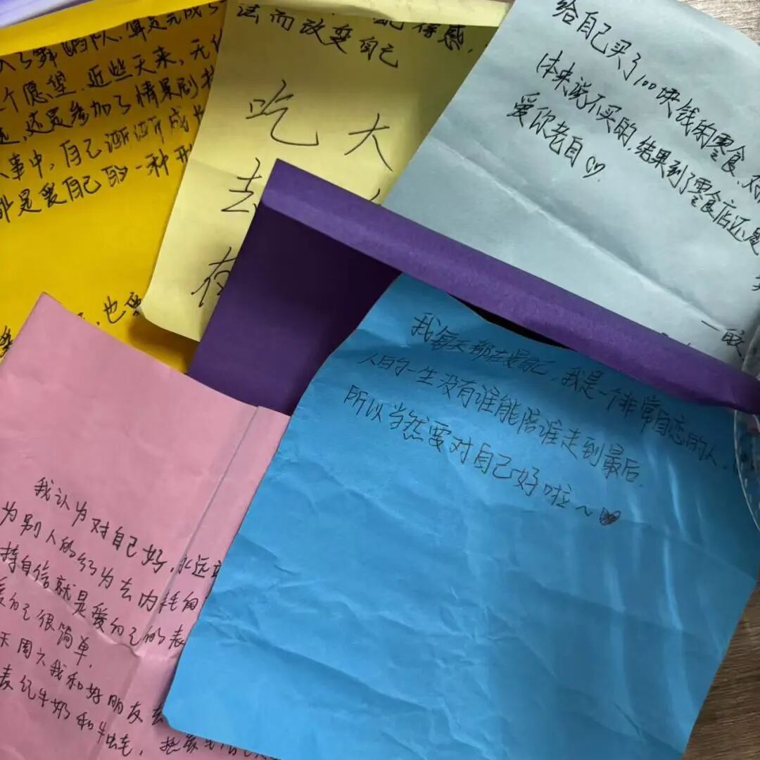 班会在歌曲《The moment》中拉开帷幕,“这一刻回头看见自己,这一路的风景,百感交集的我。”,歌词告诉我们停下来“看见自己”,看见爱自己的模样。辅导员张丹老师引导学生放下手机,静心回望“最近一次对自己好是什么时候”。在短暂而安静的思考和自我对话后,全班31名同学匿名写下了对“爱自己”的理解与表达——一句承诺、一个行动、一份接纳。所有纸条被投入“回声箱”,随后由班上同学随机抽取朗读,并在不加评判的回应中,让每一份心声都被看见、被听见。