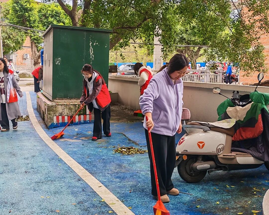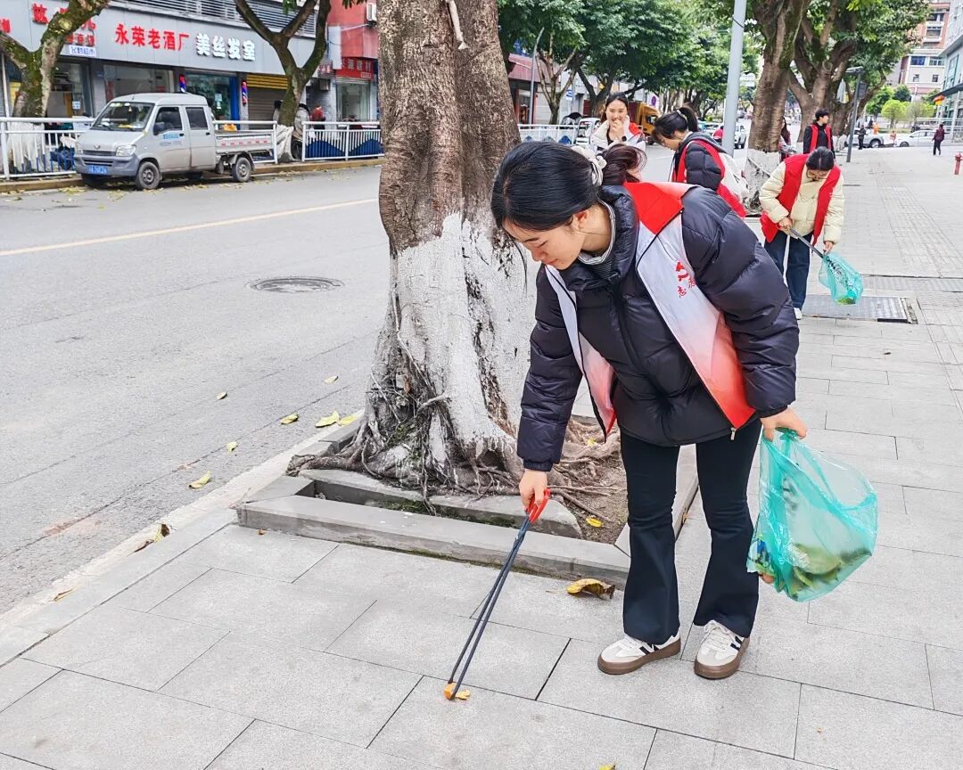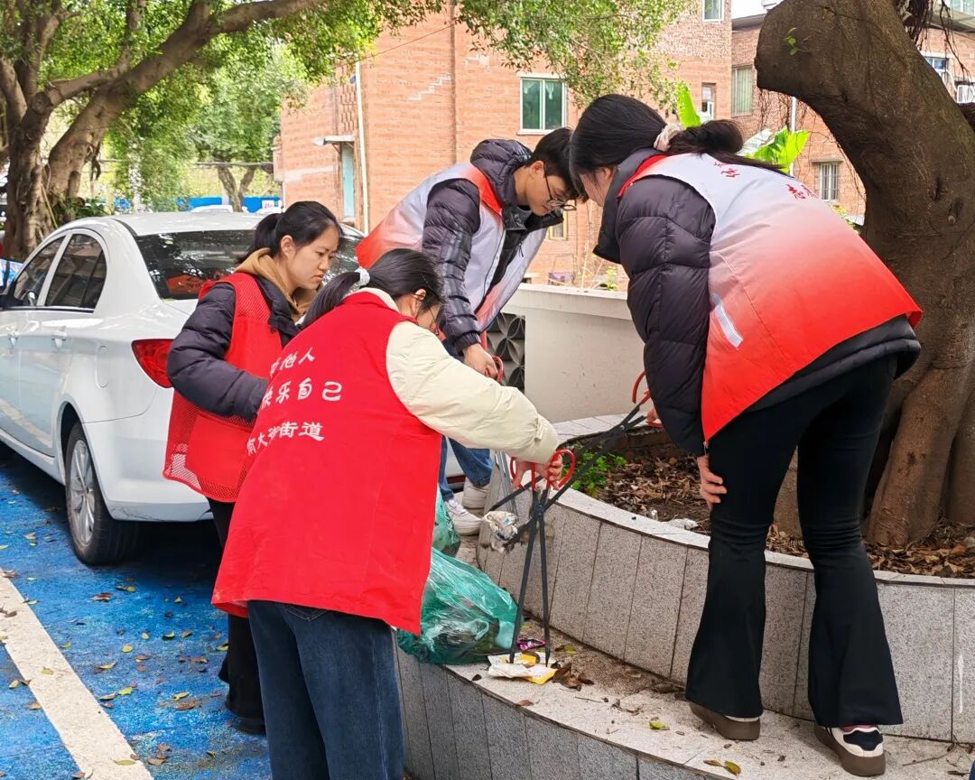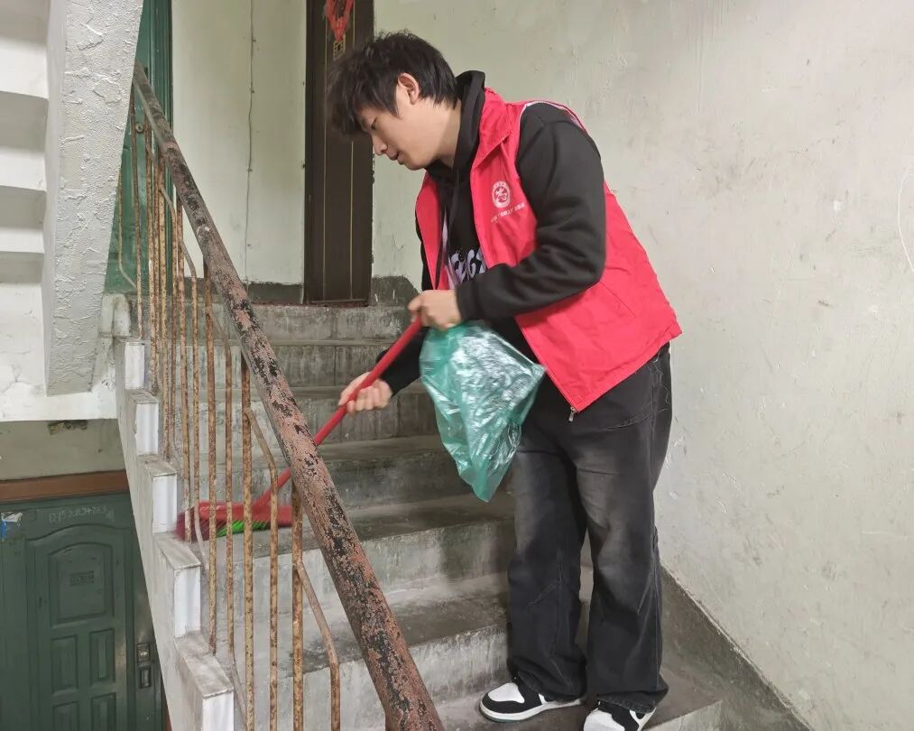 随后,志愿者们统一身着志愿马甲,手持扫帚、垃圾夹、垃圾簸箕、垃圾袋等工具,分组前往责任区域,对道路沿线、绿化带、楼道角落、公共设施周边等卫生盲区开展“地毯式”清理。大家分工协作、默契配合,弯腰捡拾白色垃圾、烟头、果皮纸屑,规整乱堆乱放杂物,不放过一处死角、不遗漏一片垃圾。劳动现场红色身影穿梭忙碌,汗水浸润衣衫,却不减服务热情,充分展现青年学子的责任与担当。