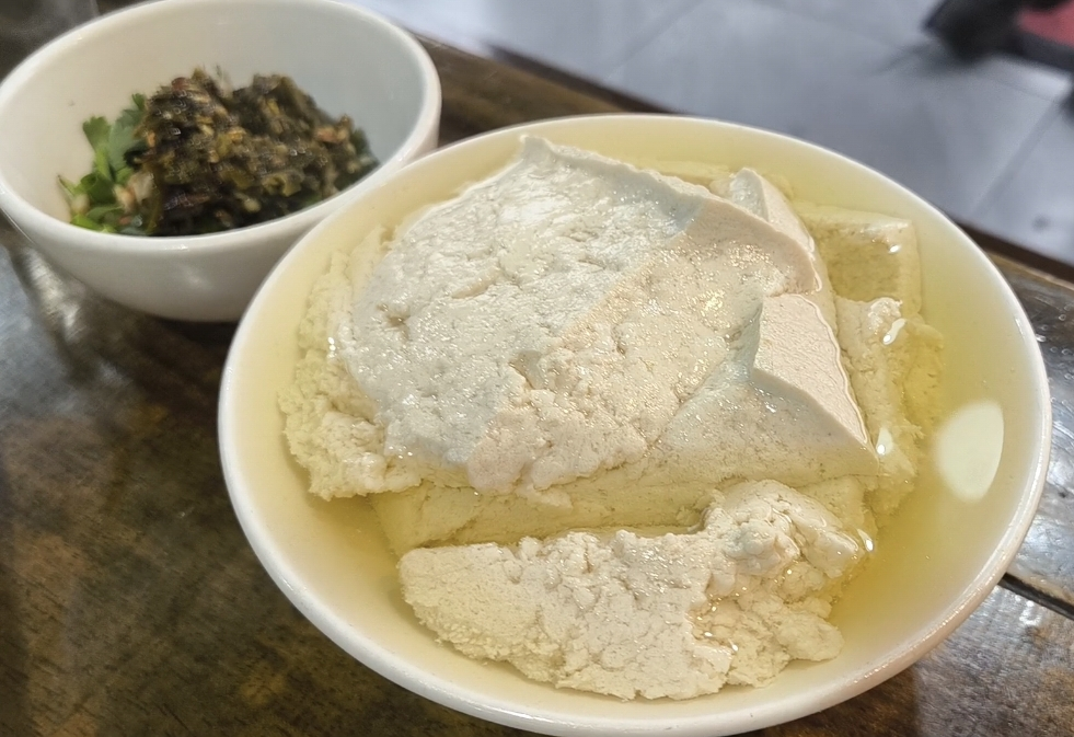 豆花洁白如雪、嫩而不散,入口绵密顺滑,自带黄豆的清甜醇香。秘制蘸水是灵魂,海椒、豆瓣、菜油、折耳根等调和而成,鲜辣醇厚,与清淡豆花完美融合。一碗豆花配一碗米饭,简单却格外满足。