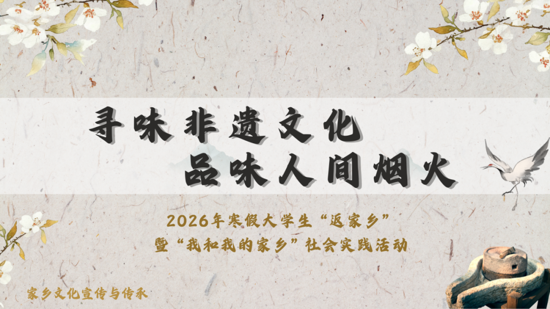 为深入学习宣传贯彻习近平新时代中国特色社会主义思想,全面贯彻落实党的二十大和二十届四中全会精神,践行《关于在新时代新征程高校思政课建设中进一步发挥共青团作用的实施意见》,加强新时代青年的思想政治教育,发挥共青团组织育人、实践育人、文化育人、网络育人等优势,体育与大健康学院团总支・学生会以寒假为契机,结合非物质文化遗产宣传与传承工作,特开展2026年寒假大学生“返家乡”暨“我和我的家乡”社会实践活动。