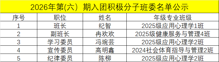 现将2026年上半年(第六期)入团积极分子培训班班委名单公示如下: