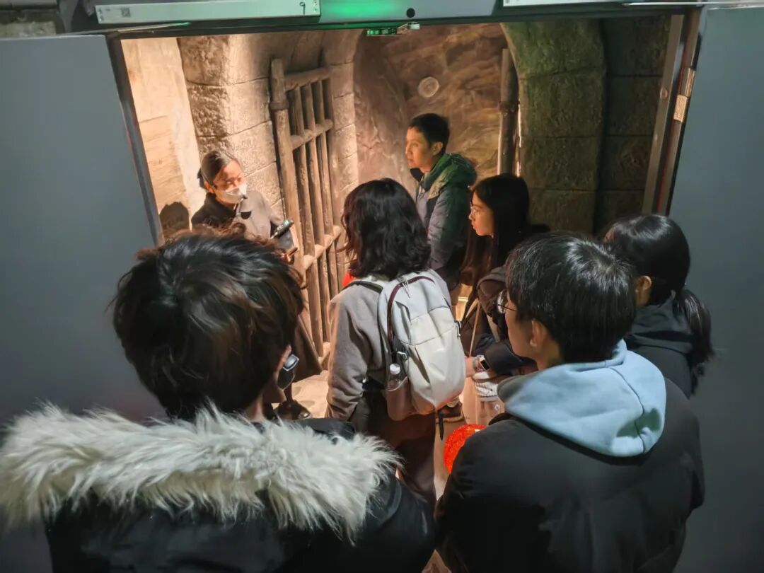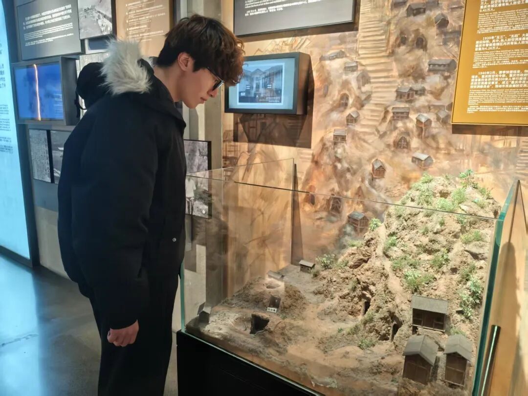 实践小队怀着肃穆的心情开启展馆研学,在讲解员的引导下,循着历史脉络依次参观展馆各个展区。不同于传统展馆的文字陈列,这里以“史料+实景+光影”的沉浸式呈现方式,让历史变得可感可触:斑驳的防空隧道石壁上,仍留存着当年避难群众的刻痕;玻璃展柜中,锈迹斑斑的炸弹残片、泛黄的防空警报记录、破损的市民避难用品,无声诉说着空袭下的艰难求生;光影特效复原的“六五”惨案现场,让队员们仿佛置身1941年6月5日的那个夜晚,感受着隧道内的窒息与绝望,更体会到上千无辜平民离世的锥心之痛。