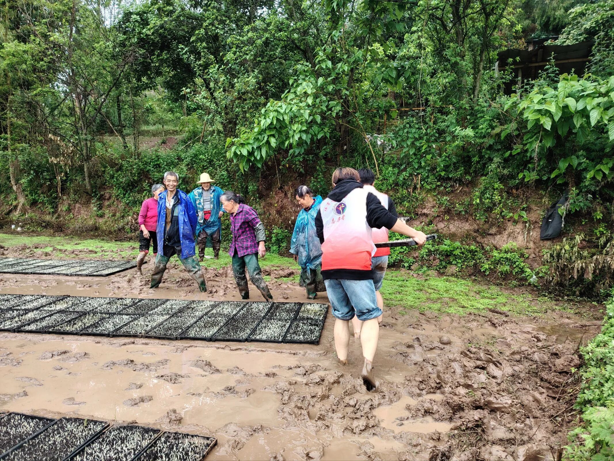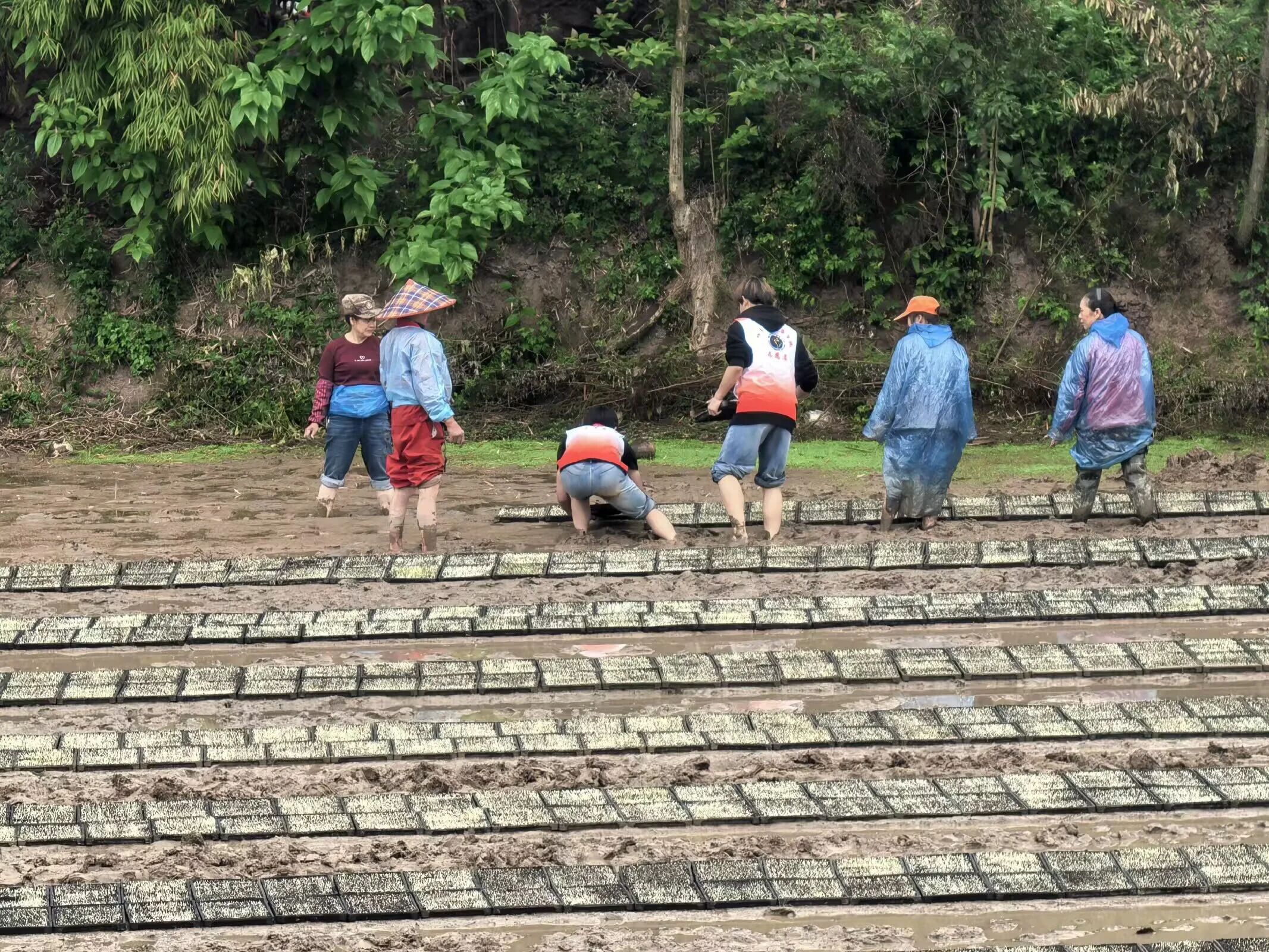 天公虽不作美,细雨绵绵,却丝毫没有影响志愿者们的热情。大家按照农田田坎位置,迅速投入到紧张的搬运工作中。雨中,志愿者们分工协作,小心翼翼地将一盘盘嫩绿的秧苗从卡车搬运至插秧田块。雨水打湿了衣衫,泥泞沾满了鞋裤,但身着红马甲的志愿者们依然躬身弯腰、接力传递,在雨中形成一道温暖的风景线。