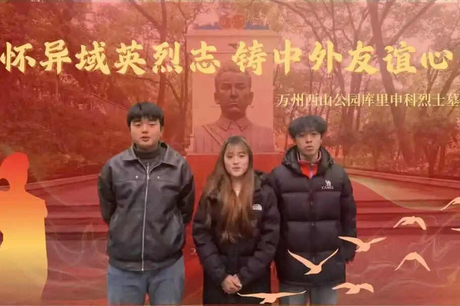 实践内容:2026年1月14日,怀英致远实践团向文芳、刘泓凯、向健磊、黄森、陈文俊前往重庆万州西山公园库里申科烈士墓,开展以“怀异域英烈志,铸中外友谊心”为主题的红色教育活动。活动期间,实践成员瞻仰库里申科烈士墓,品读镌刻于墓园的文字印记,感悟中苏友谊传承与英雄不朽精神。库里申科烈士是中俄人民友谊的重要象征,其事迹彰显着跨越国界的责任与担当。实践团队提前查阅史料、撰写解说词、打磨拍摄脚本,以严谨态度完成红色主题视频拍摄,助力红色故事广泛传播。