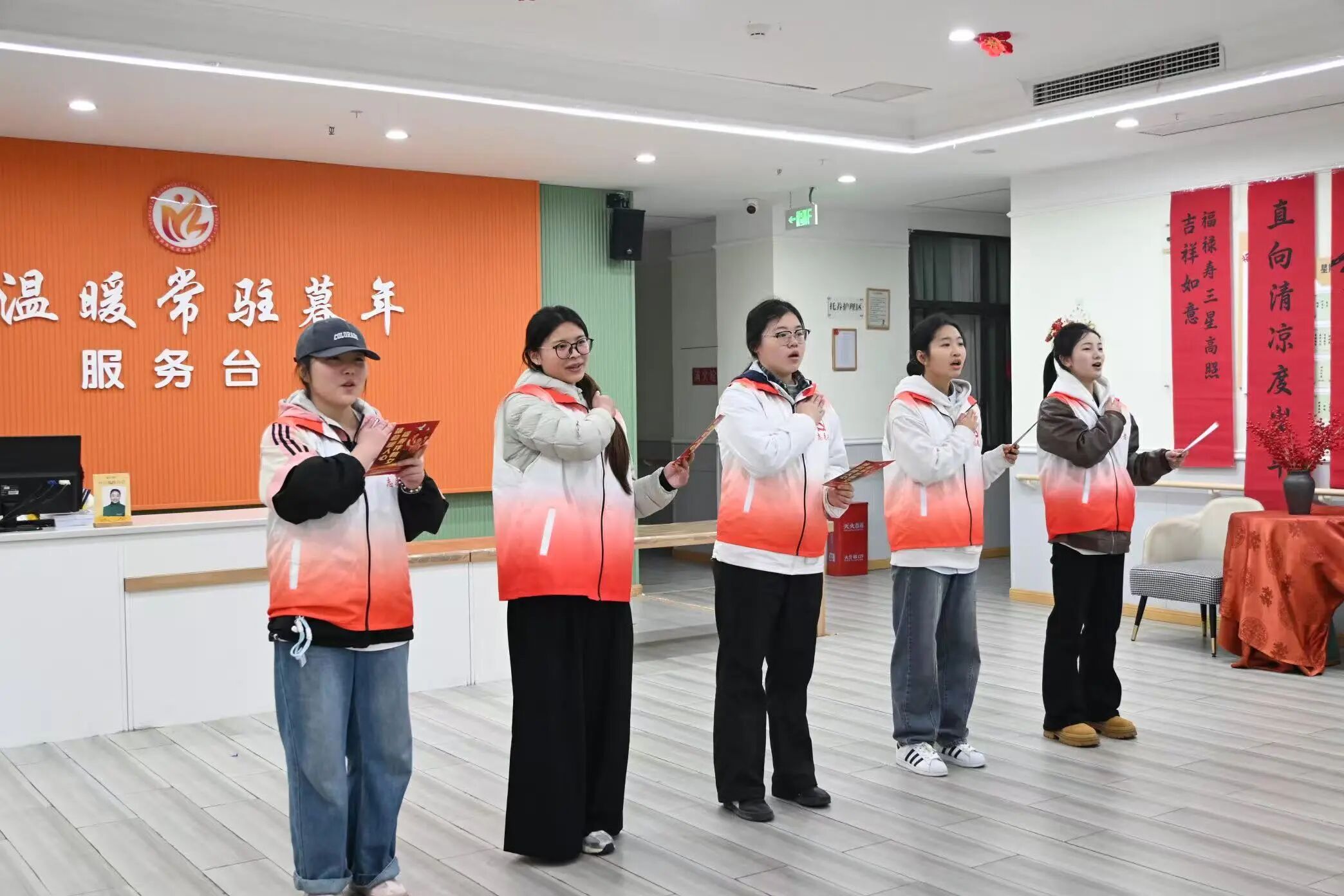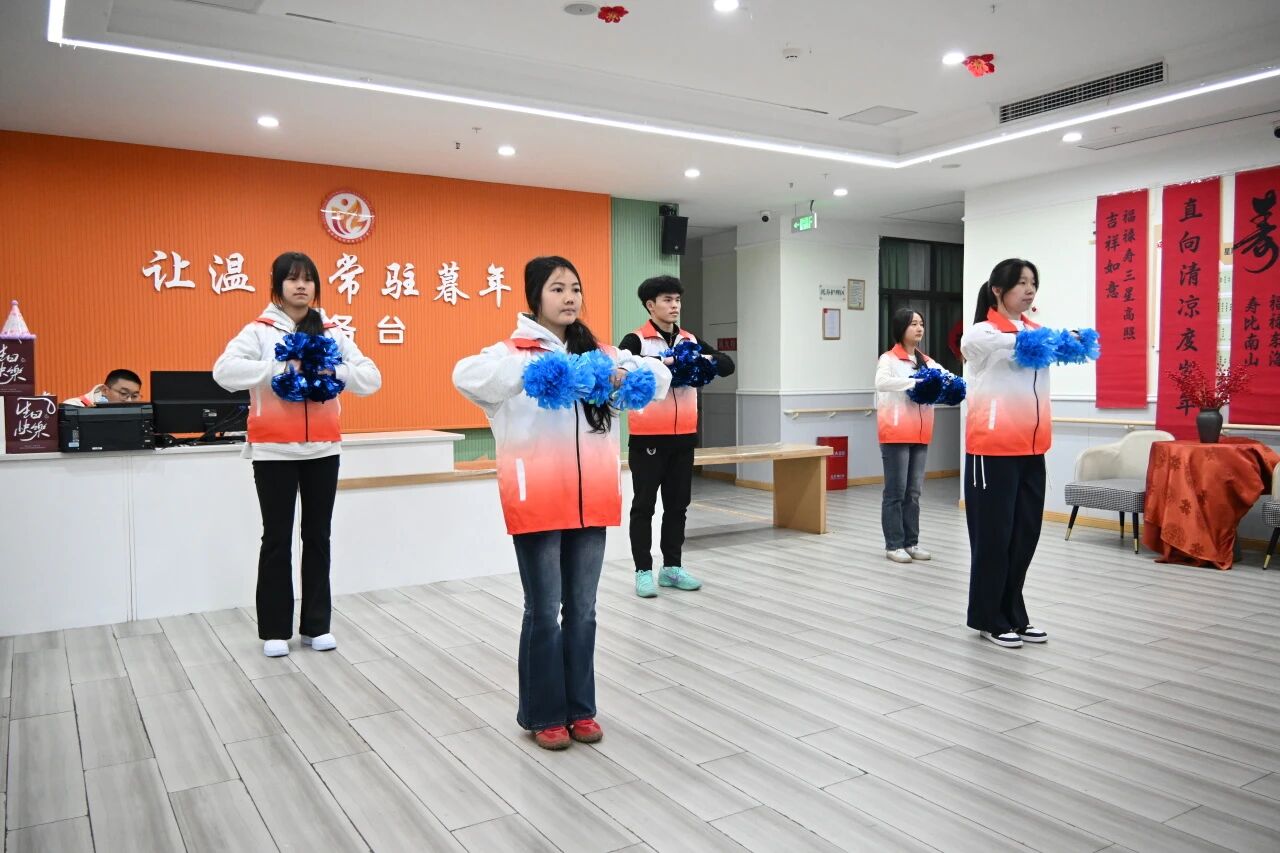 活动在青春洋溢的啦啦操表演中展开,伴随着动感欢快的音乐节奏,志愿者们身着统一服装,以整齐划一的动作、饱满昂扬的精神状态,为老人们献上精心编排的《Zoo》啦啦操。跳跃、旋转,每一个动作都洋溢着蓬勃朝气。老人们被这份热情所感染,纷纷鼓掌,氛围热闹且温馨。
