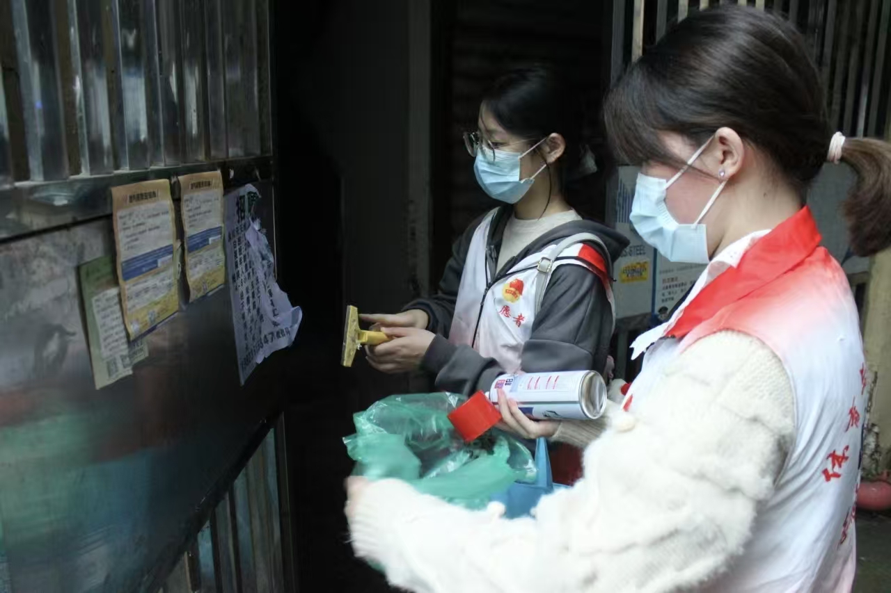 活动当日,同学们携带清洁工具及心理疏导相关物资准时抵达社区。在详细了解受灾群众的具体情况后,团员志愿者们迅速展开分工协作:部分成员主动与受灾群众沟通交流,耐心倾听其诉求,运用专业知识帮助缓解焦虑、恐惧等负面情绪;其余成员则手持抹布、铲刀、清洁剂等工具,细致擦拭门窗玻璃、彻底清除墙面不当小广告、有序归整室内杂物。全体成员一丝不苟,不放过任何卫生死角,劳动过程中始终伴随着轻声的问候与真诚的鼓励,现场氛围温暖而有序。