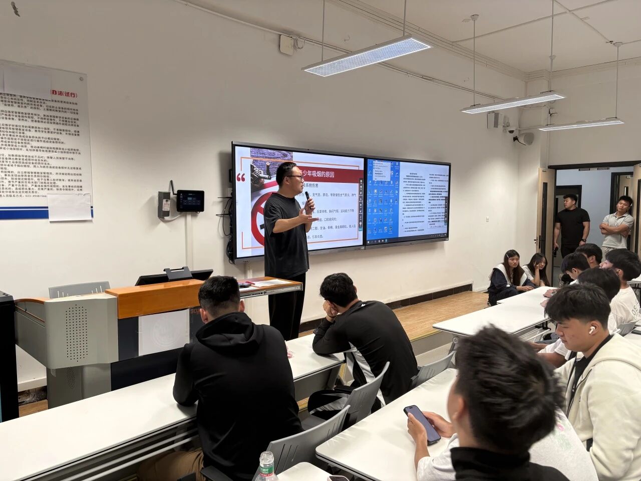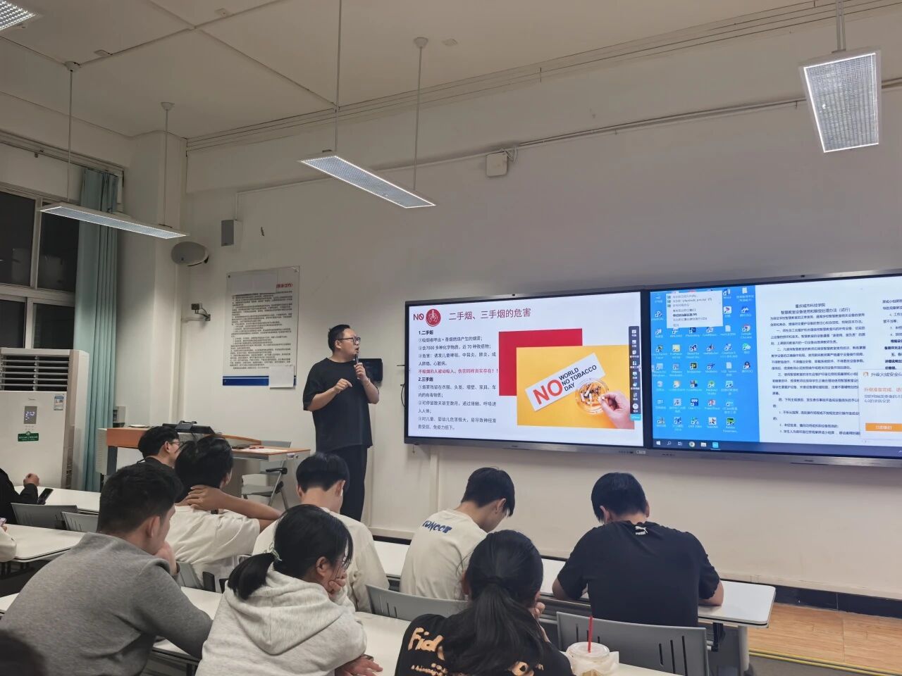 针对禁烟与健康教育,王老师系统讲解青少年吸烟对呼吸系统、心血管系统、免疫力及大脑认知功能的多重危害,明确电子烟同样具有成瘾性与健康风险;同时强调二手烟、三手烟对身边同学的长期危害,呼吁大家远离烟草、拒绝第一支烟。他重申校园全域禁烟规定,教室、宿舍、实验室、图书馆、食堂等公共场所一律禁止吸烟,违规吸烟、乱扔烟头等行为将按校规严肃处理。