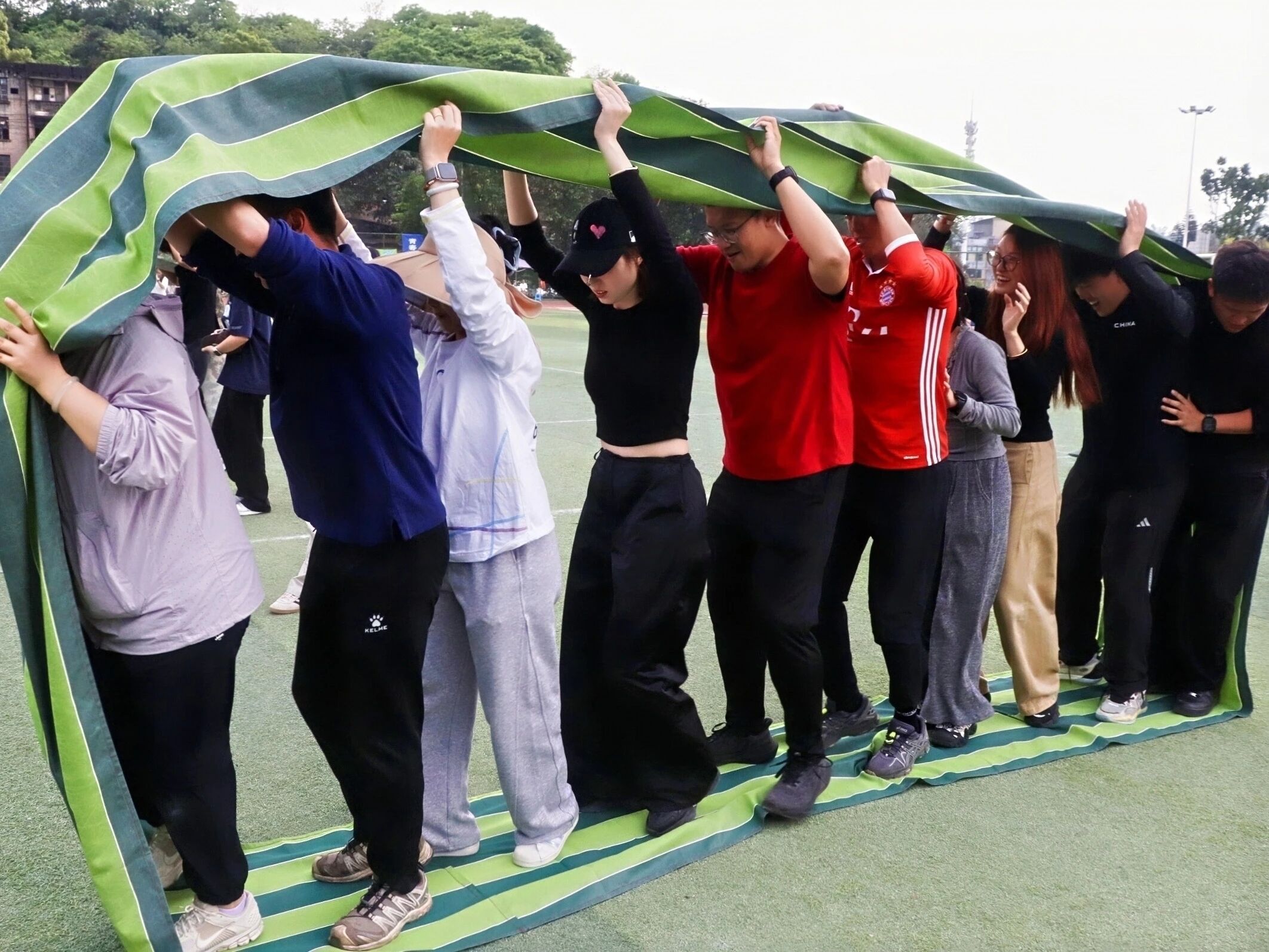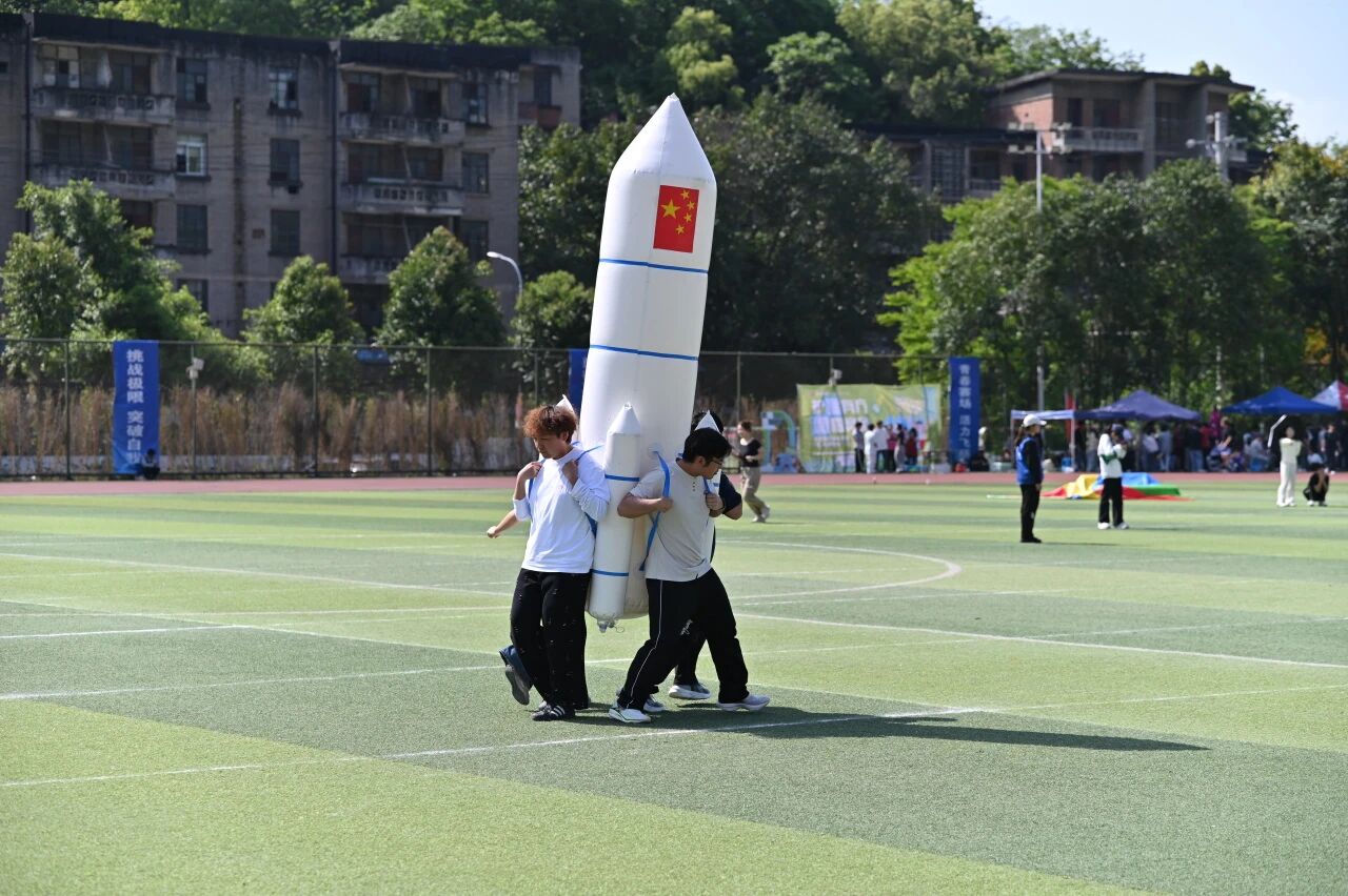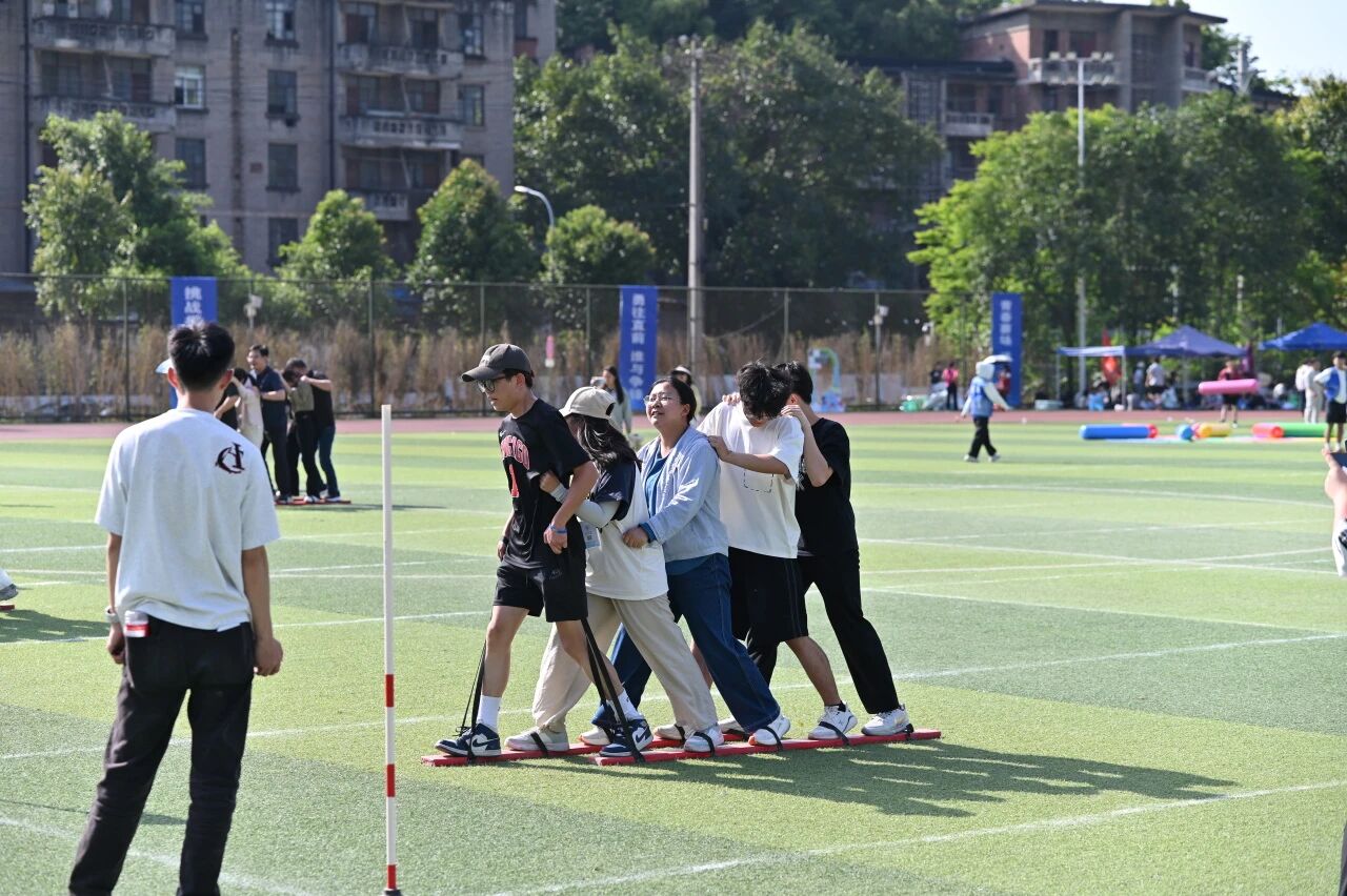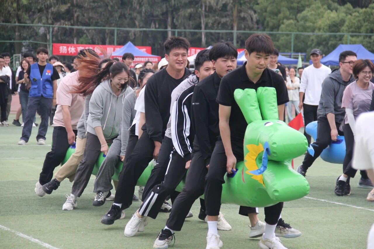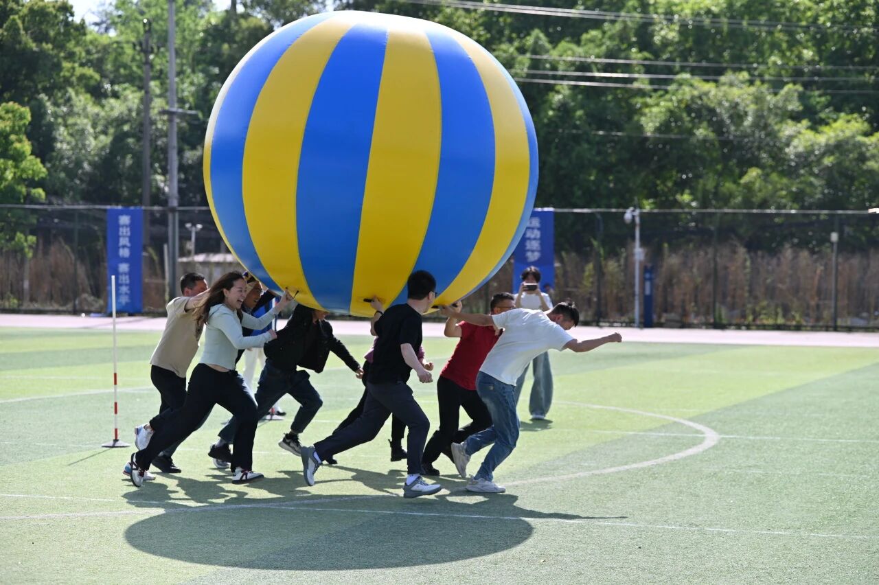 趣味团体项目同样精彩不断,欢声笑语与拼搏呐喊交织。旱地龙舟项目热闹开赛,教职工们跨坐充气长龙,齐声呐喊、步调一致,协同迈步向前冲,整齐的口号与欢快的步伐相映成趣,尽显团队默契;擎天接力环节,众人合力托起充气柱,奔跑绕桩、平稳交接,每一次配合都凝聚着满满的团队向心力;有轨电车赛场,全员同踏长板、齐心发力,步伐统一稳步前行,以默契协作奔赴终点,一幕幕团结又温馨的瞬间,尽显体院教职工凝心聚力、乐观向上的精神风貌。