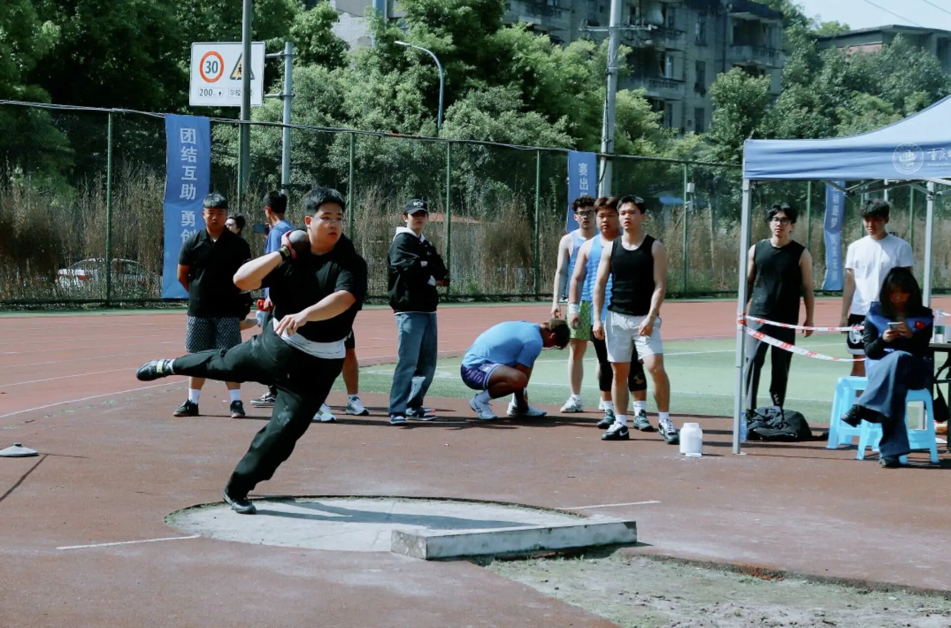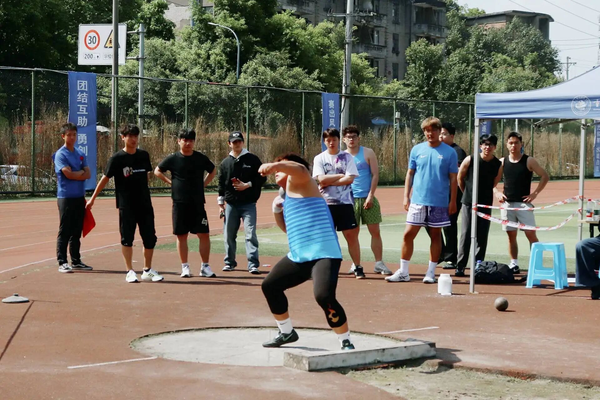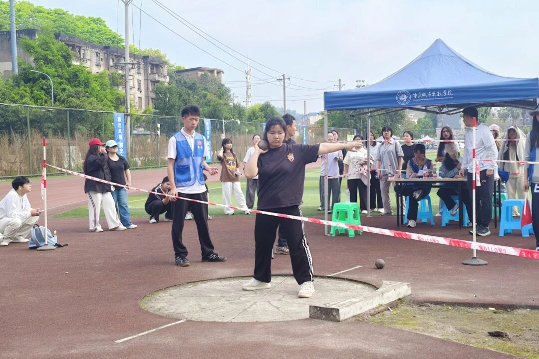 铅球投掷区,男子选手蓄力、转身、猛掷,用力量划破长空,强势打破赛事纪录,尽显体院学子的磅礴力量。