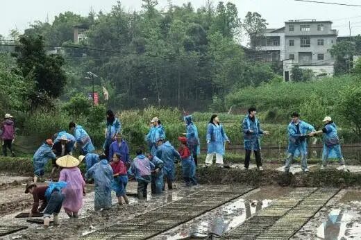 随后,志愿者们在农户的悉心指导下,迅速投入到秧苗搬运与插秧工作中。尽管细雨绵绵、泥土湿滑,大家依旧分工协作、干劲十足,小心翼翼地将一盘盘嫩绿秧苗从卡车搬运至插秧田块,挽起裤脚踏入水田,将一株株秧苗整齐插入田中,从生疏到熟练,用汗水浇灌希望,以实干践行 “奉献、友爱、互助、进步” 的志愿精神,赢得了当地农户的一致好评。