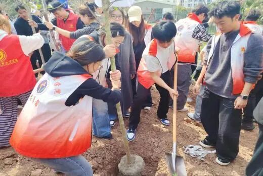 活动中,志愿者们化身“绿色使者”分工协作,挥锹挖坑、扶正树苗、填土浇灌,同时俯身清理杂草枯枝,精心呵护蓝花楹幼苗。暖阳下,“志愿红”与“草木绿”相映成趣,校园尽显生机。