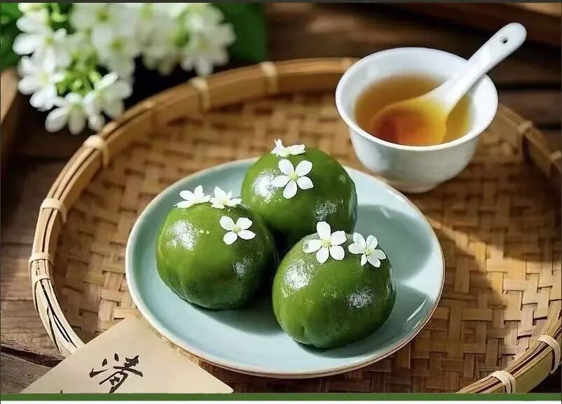 青团选用清明前后鲜嫩的艾草、鼠曲草榨汁,与糯米粉揉成青绿面团,包裹豆沙、芝麻、咸蛋黄肉松、咸菜笋丁等馅料蒸制而成,成品色泽油绿、口感软糯,带着淡淡的草木清香。古时寒食禁火,人们提前做好青团这类冷食,无需生火即可食用,慢慢演变成清明专属时节吃食。青团外形圆润,寓意阖家团圆、平安顺遂,青绿之色对应春日生机,也暗含缅怀先人、感念春光的双重心意,既是节日的仪式感,也是尝春鲜、忆传统的体现。