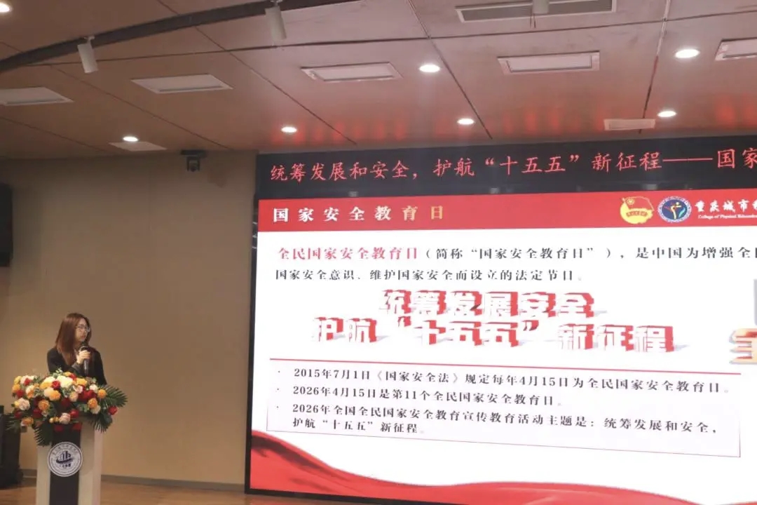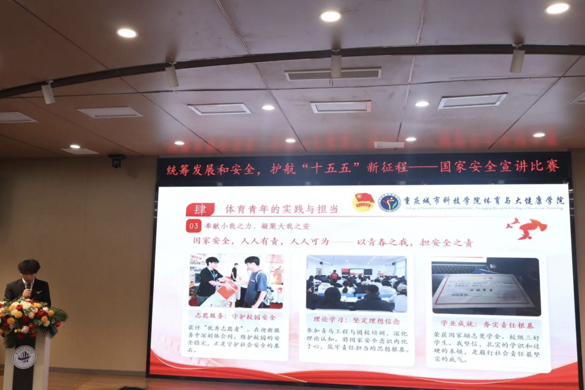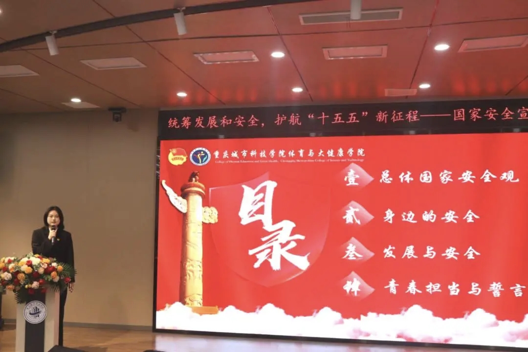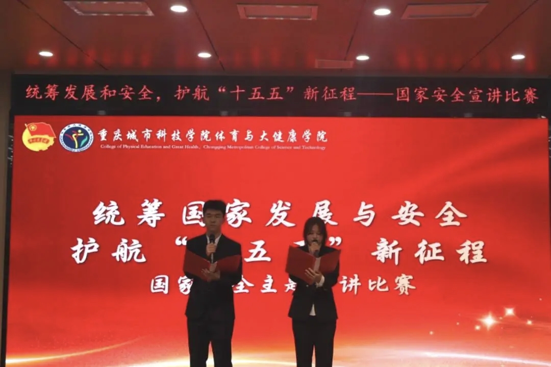 为深入学习贯彻习近平新时代中国特色社会主义思想,全面落实党的二十大和二十届四中全会精神,坚定不移贯彻总体国家安全观,4月8日,体育与大健康学院在第二学术报告厅举办“统筹发展和安全・护航‘十五五’新征程”国家安全主题宣讲比赛决赛。体育与大健康学院团总支书记王胜蓝、就业创业板块负责老师鲁馨刚、学生第二党支部书记周君婷、团学指导老师闵力文担任评委,团学工作人员王昌红、蒲政宇主持。