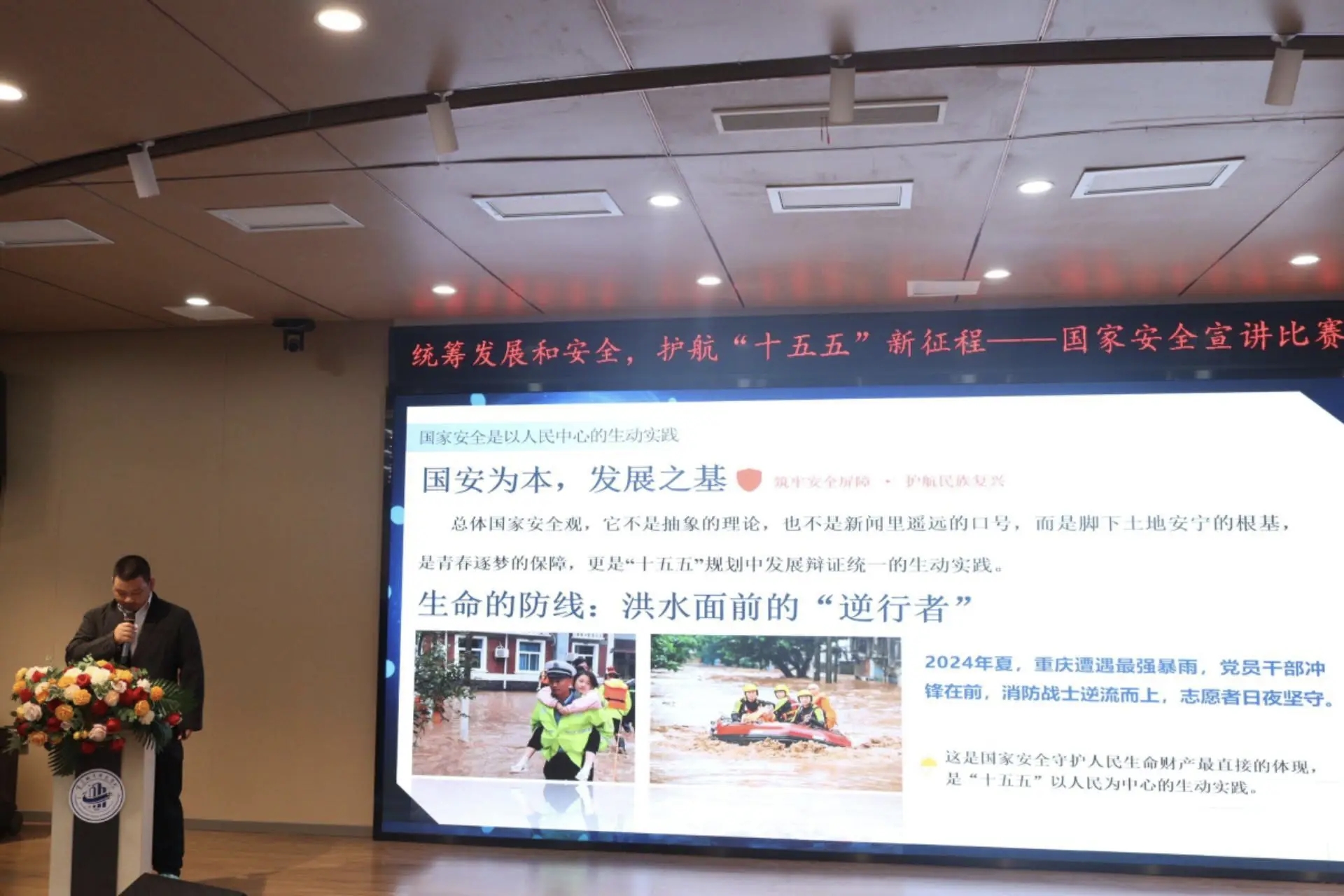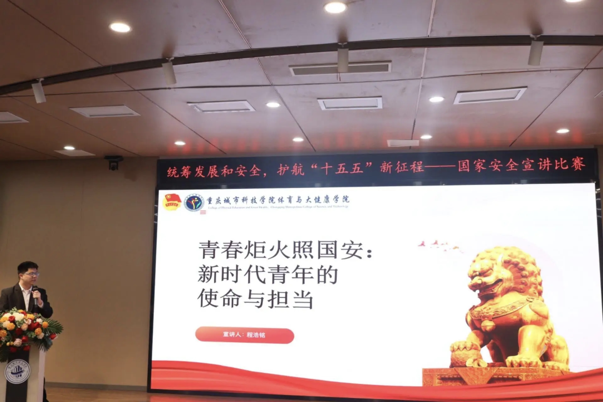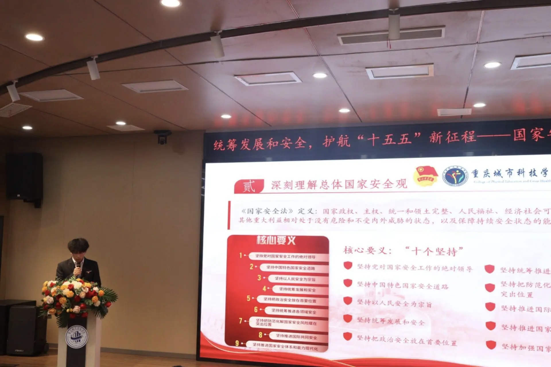 为深入学习贯彻习近平新时代中国特色社会主义思想,全面落实党的二十大和二十届四中全会精神,坚定不移贯彻总体国家安全观,4月8日,体育与大健康学院在第二学术报告厅举办“统筹发展和安全・护航‘十五五’新征程”国家安全主题宣讲比赛决赛。体育与大健康学院团总支书记王胜蓝、就业创业板块负责老师鲁馨刚、学生第二党支部书记周君婷、团学指导老师闵力文担任评委,团学工作人员王昌红、蒲政宇主持。