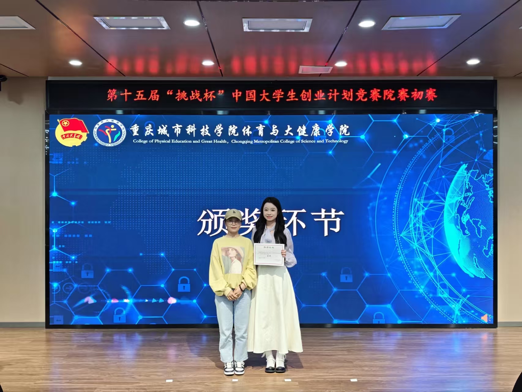 体育与大健康学院学生第一党支部书记王静、就业创业板块负责人鲁馨刚为获得三等奖的队伍颁奖