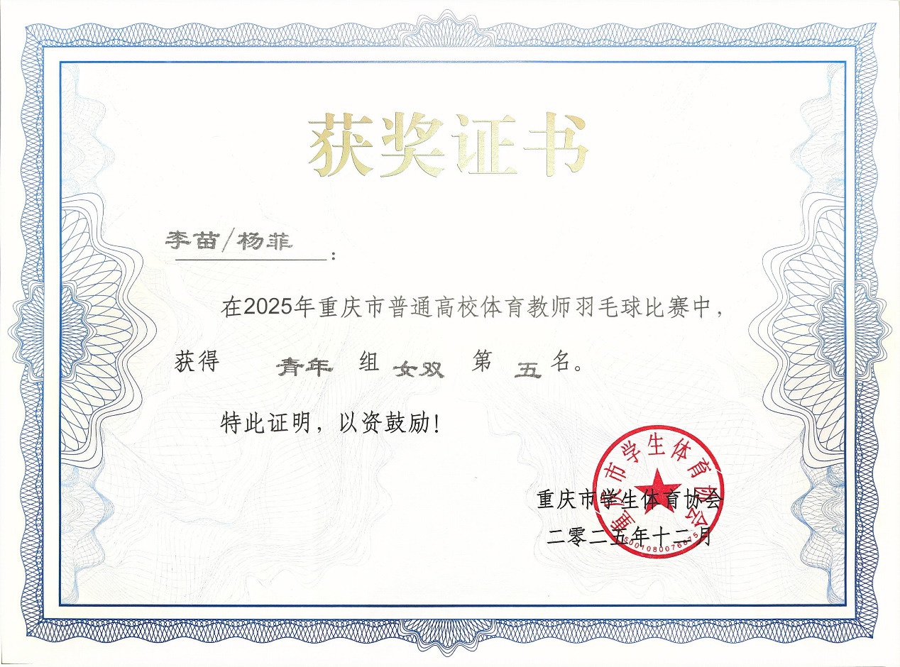 为进一步推动重庆市普通高校体育教师队伍建设,丰富体育教师课余文化生活,提升体育教师羽毛球运动竞技水平,2025年12月27日,2025年重庆市普通高校体育教师羽毛球比赛在重庆大学虎溪校园体育中心顺利举办。我系部体育教师李苗作为代表学校参赛的教师之一,在青年组女双项目中与搭档奋勇拼搏,最终斩获第五名的优异成绩。