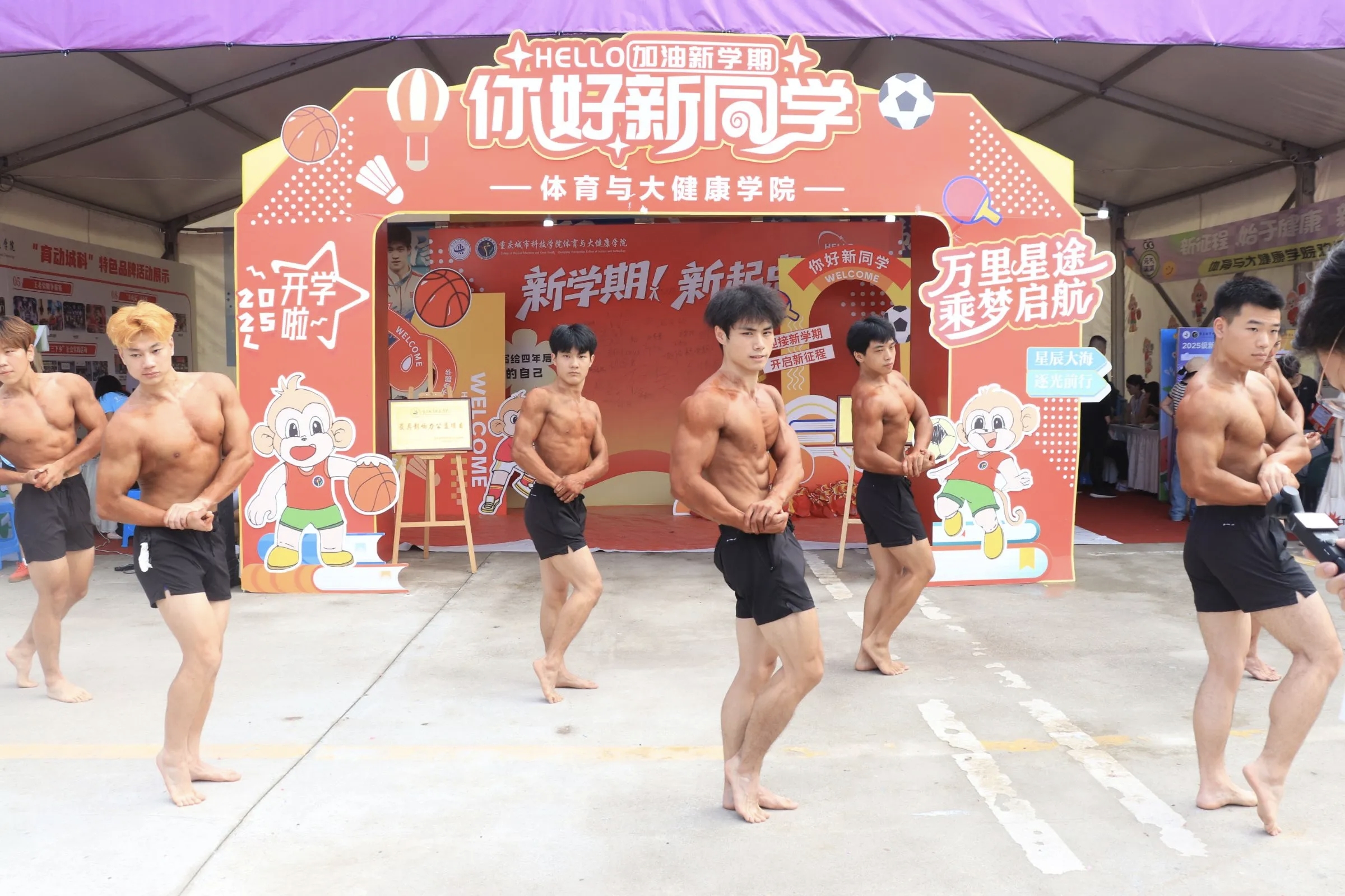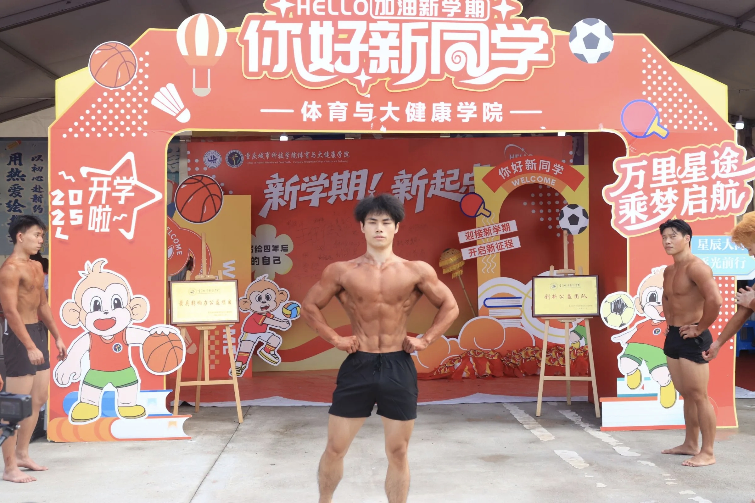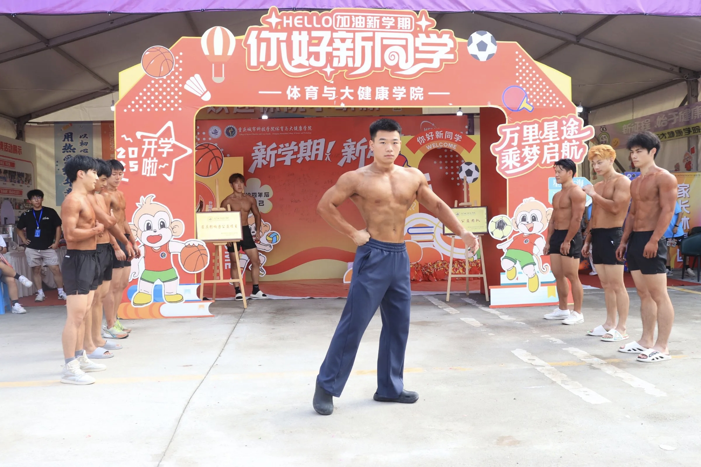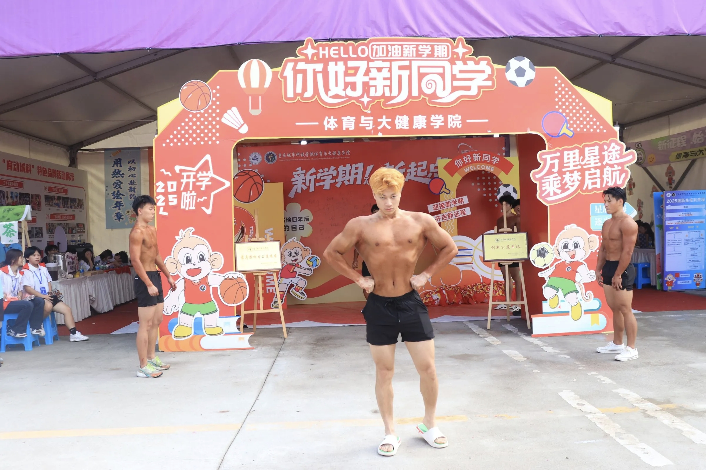 狂欢氛围未散,9月14日清晨,朝阳下健身健美表演开启。他们着黑色长裤,身上涂抹凸显肌肉线条的色彩,自信登台,晨光中清晰的肌肉线条与标准展体动作尽显力量,台下快门声与 “哇”声不断。表演结束后,他们还走下舞台与新生热情互动,陪同有需求的新生前往报到处报到。