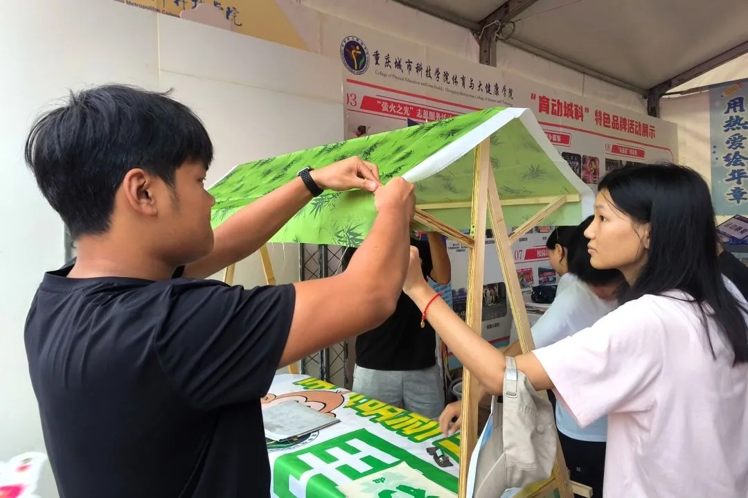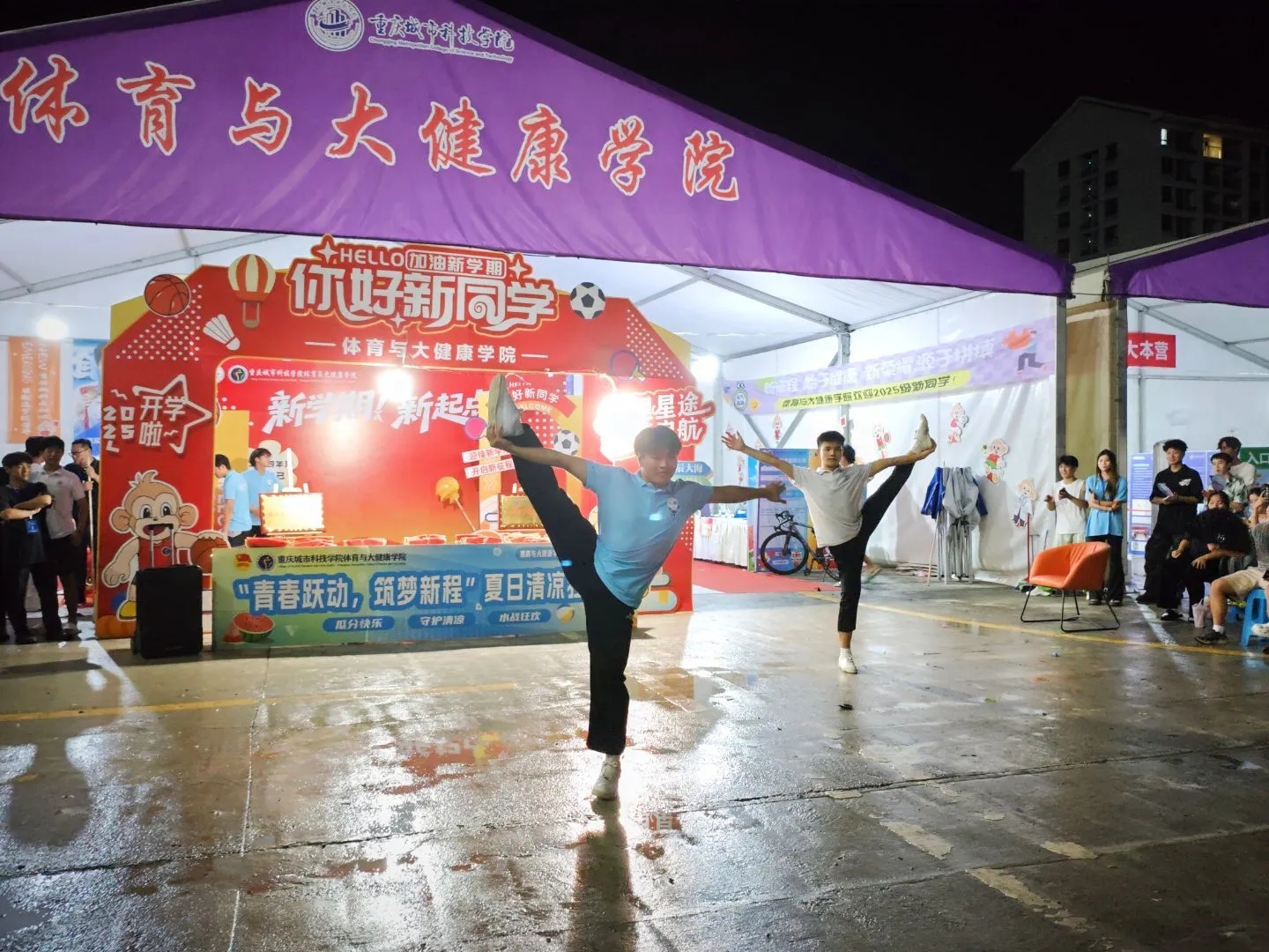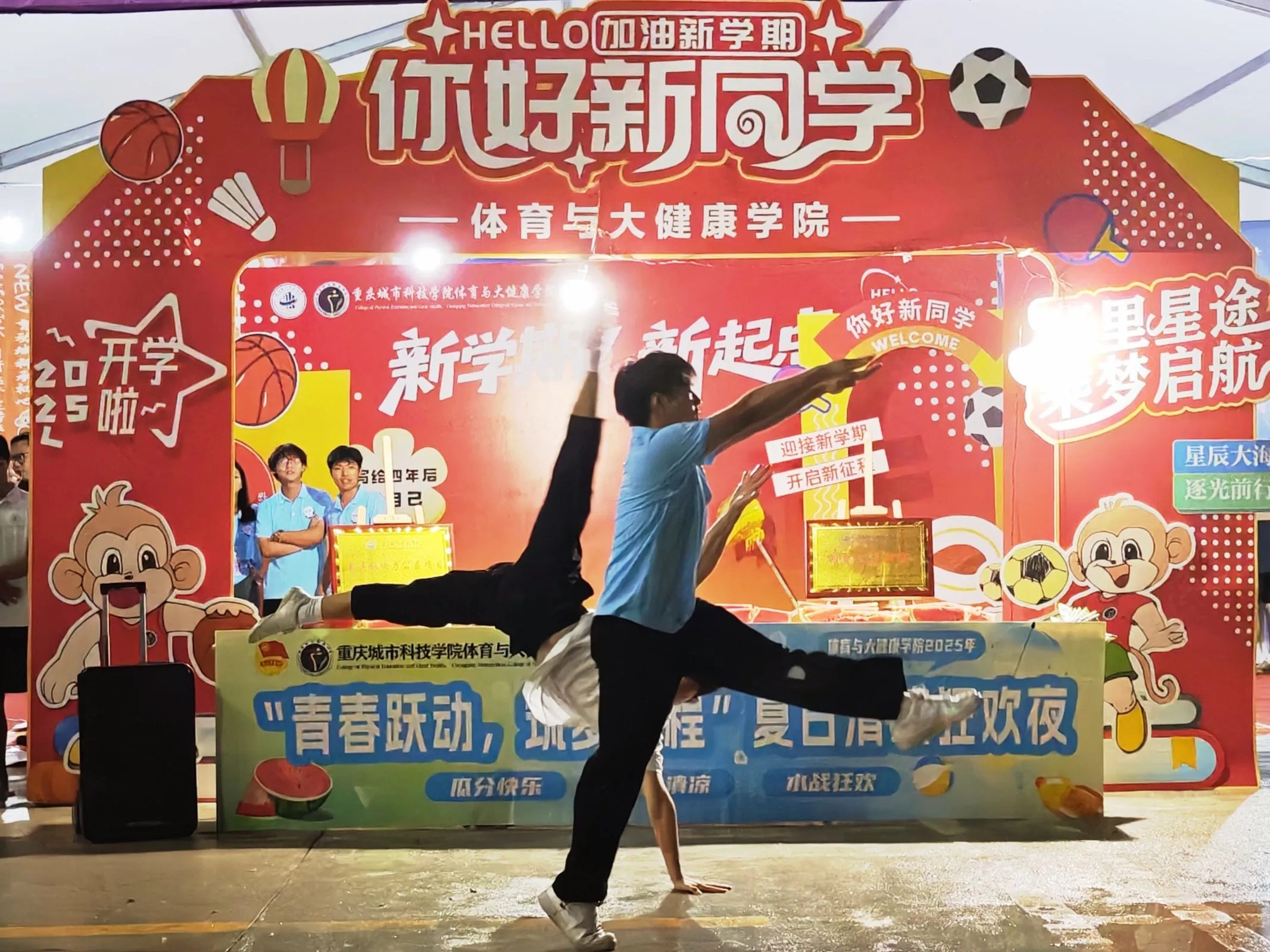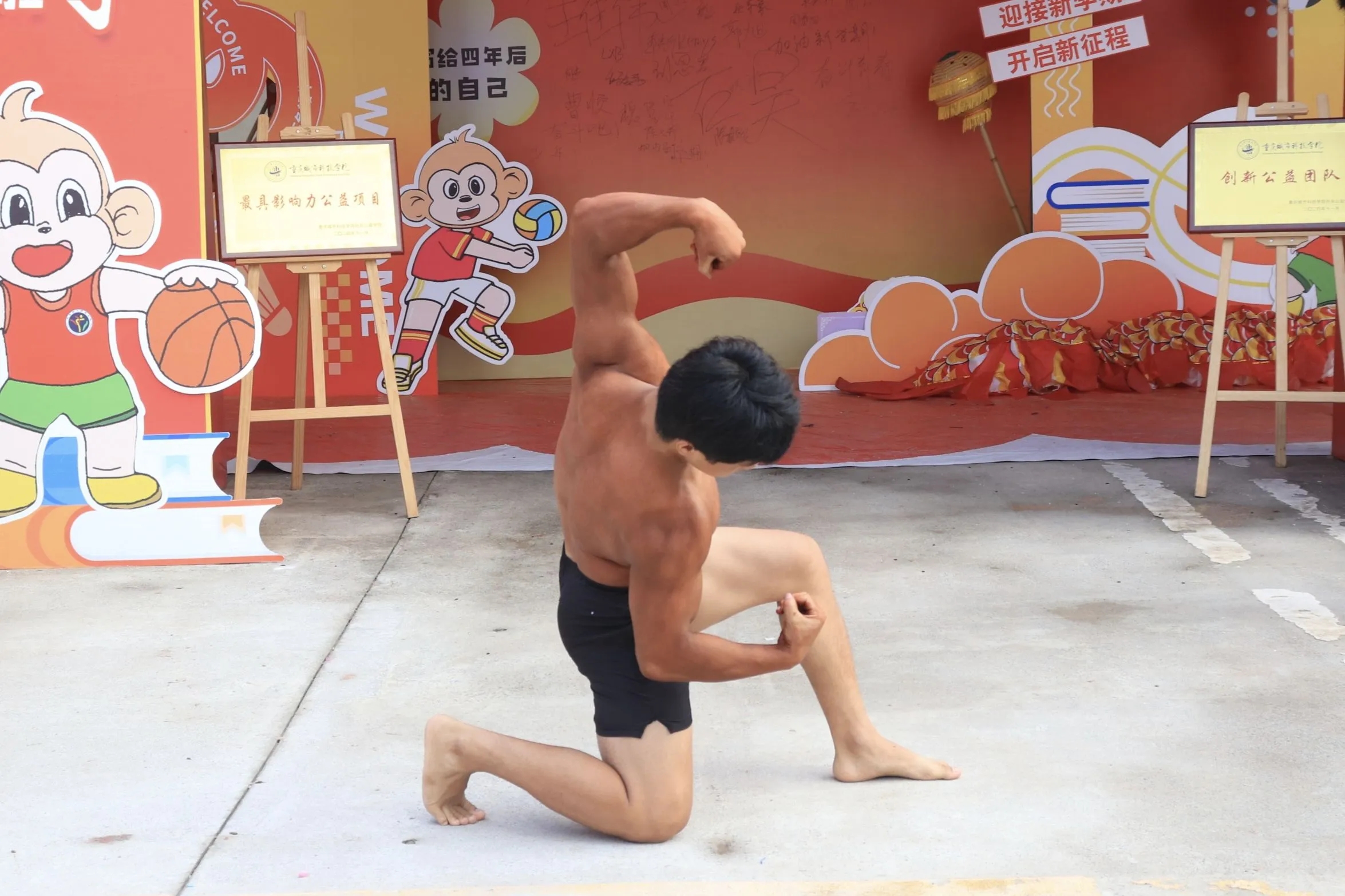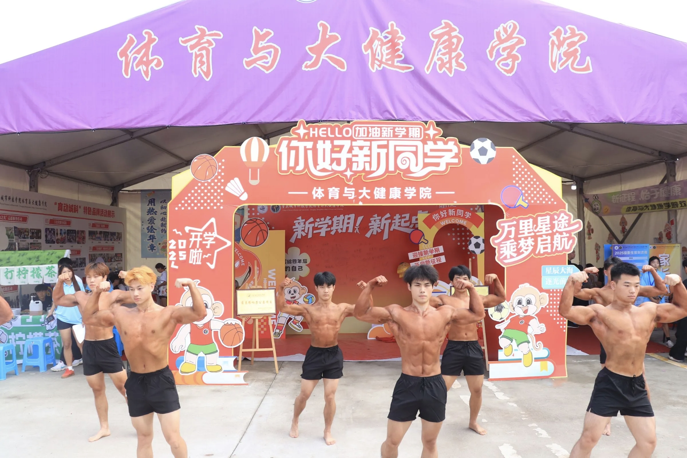 狂欢氛围未散,9月14日清晨,朝阳下健身健美表演开启。他们着黑色长裤,身上涂抹凸显肌肉线条的色彩,自信登台,晨光中清晰的肌肉线条与标准展体动作尽显力量,台下快门声与 “哇”声不断。表演结束后,他们还走下舞台与新生热情互动,陪同有需求的新生前往报到处报到。