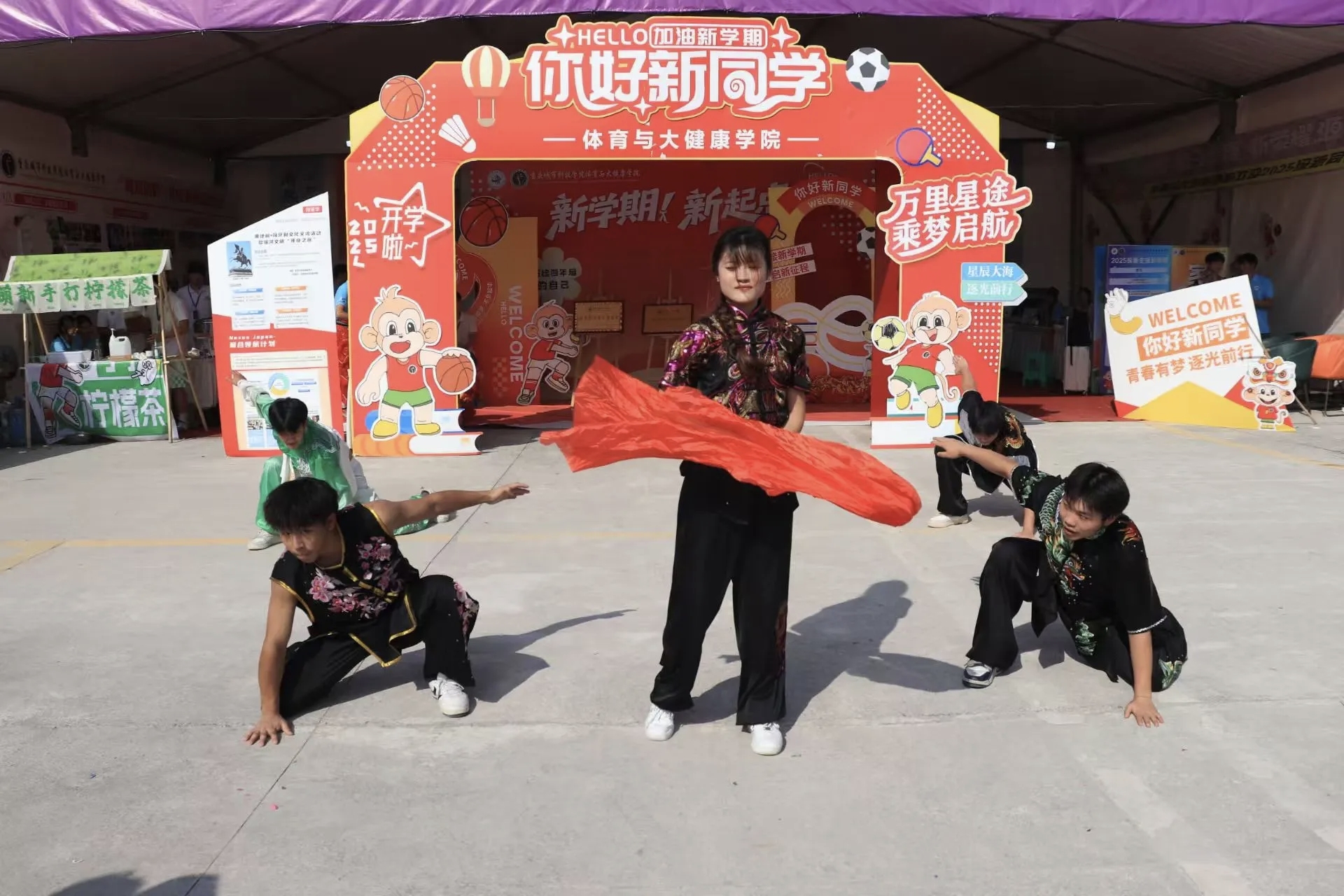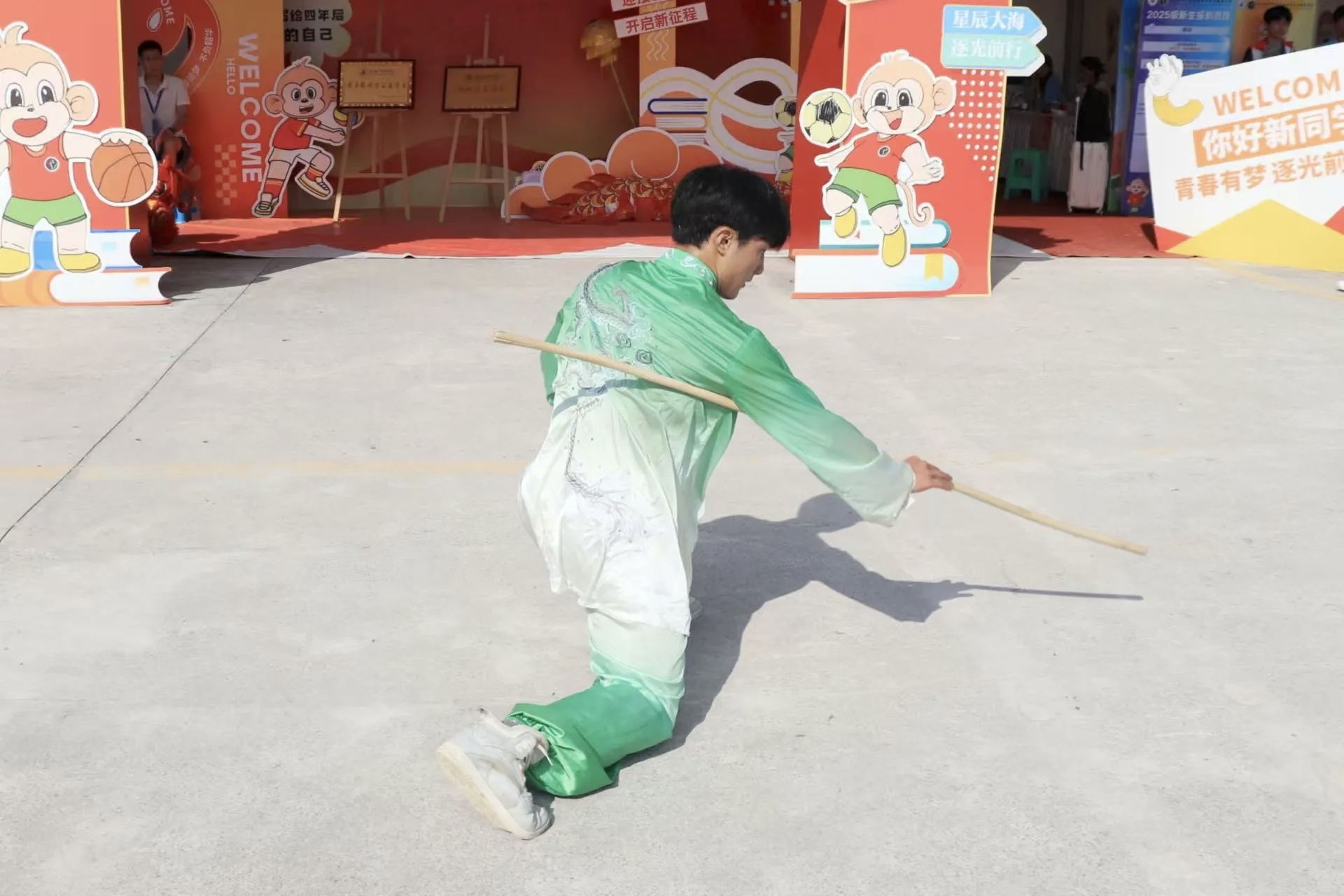 午后,武术表演再亮相:刀剑挥舞凌厉、长棍横扫有力,集体拳刚柔并济,九节鞭在空中划出流畅弧线,精彩对练尽显扎实功底,赢得阵阵喝彩,为迎新活动添浓文化气息。