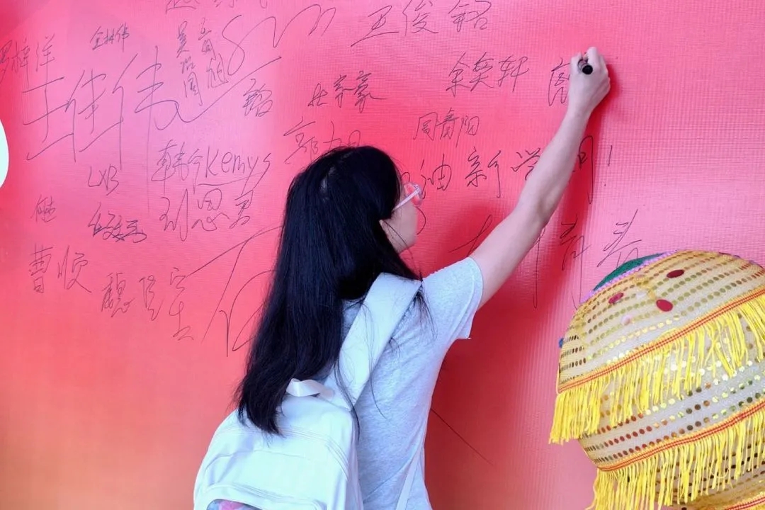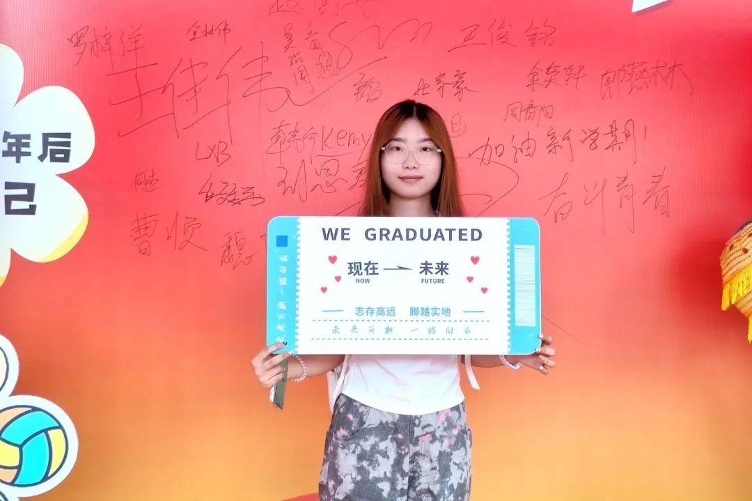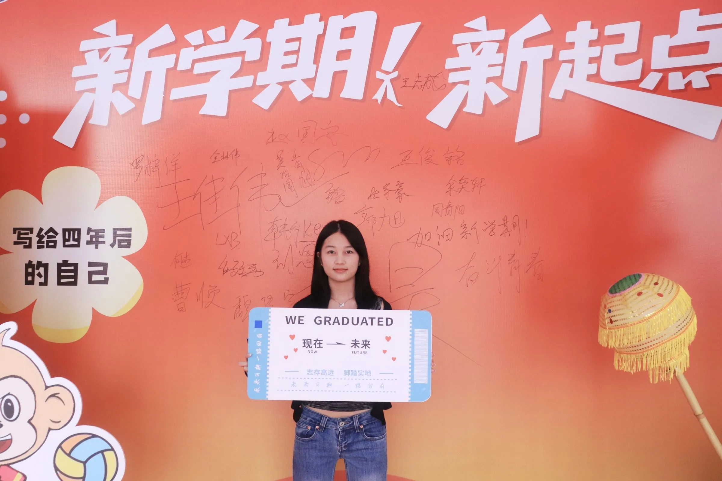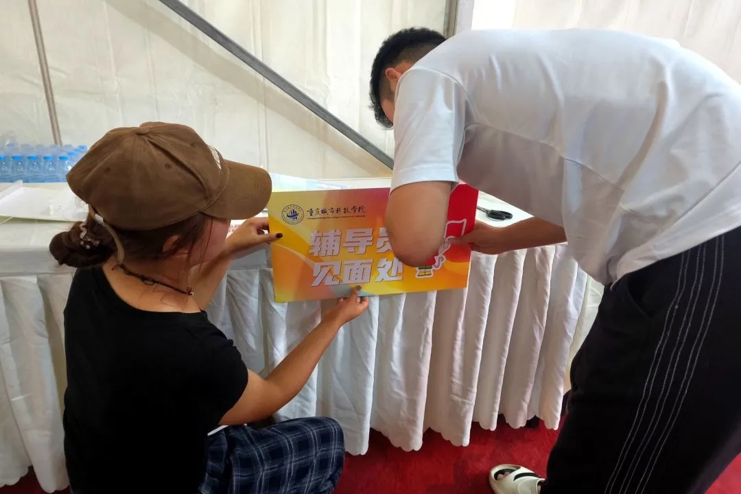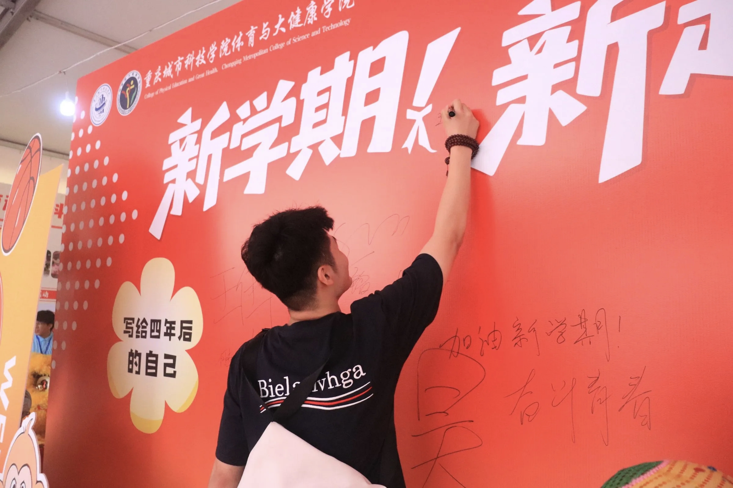除了提供周到细致的报到服务,学院还特别设置了主题迎新打卡墙。宣传志愿者们热情邀请新生及家长在打卡墙前合影留念、签字纪念,用镜头定格初入大学的欣喜与期待。打卡墙设计融合学院特色与迎新主题,每一张照片都承载着新生对未来的美好憧憬。